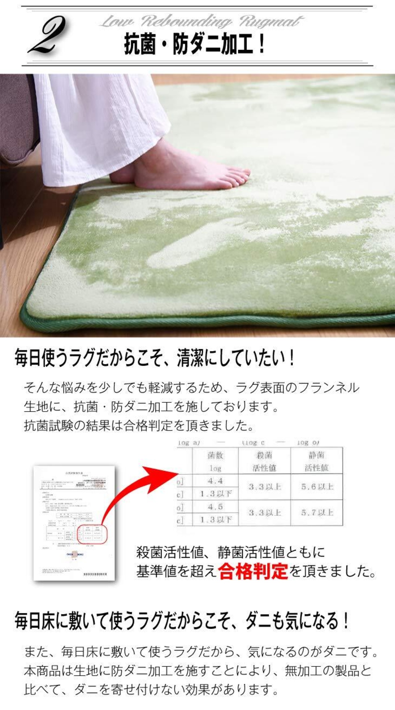【抗菌・防ダニ加工】高密度マイクロファイバー生地に抗菌・防ダニを施しました。毎日使うラグだから清潔にご使用いただけます。
