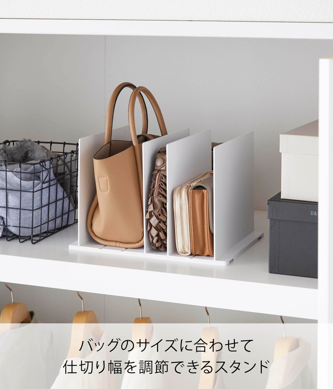 倒れやすい鞄も立てて収納できるから、場所を取らずスリムに収納できます。