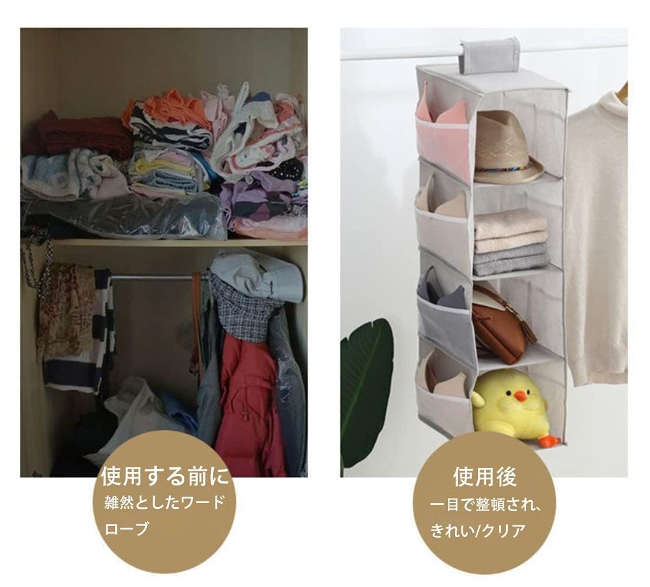 【高品質無臭素材】クローゼット吊り下げ収納は良質な不織布を採用しており、安全無臭、通気性に優れていて、吸湿性もあります。収納ラックの中間層は硬いPP板が入っているため、耐力が強くて、吊るして収納型崩れ防止できます。