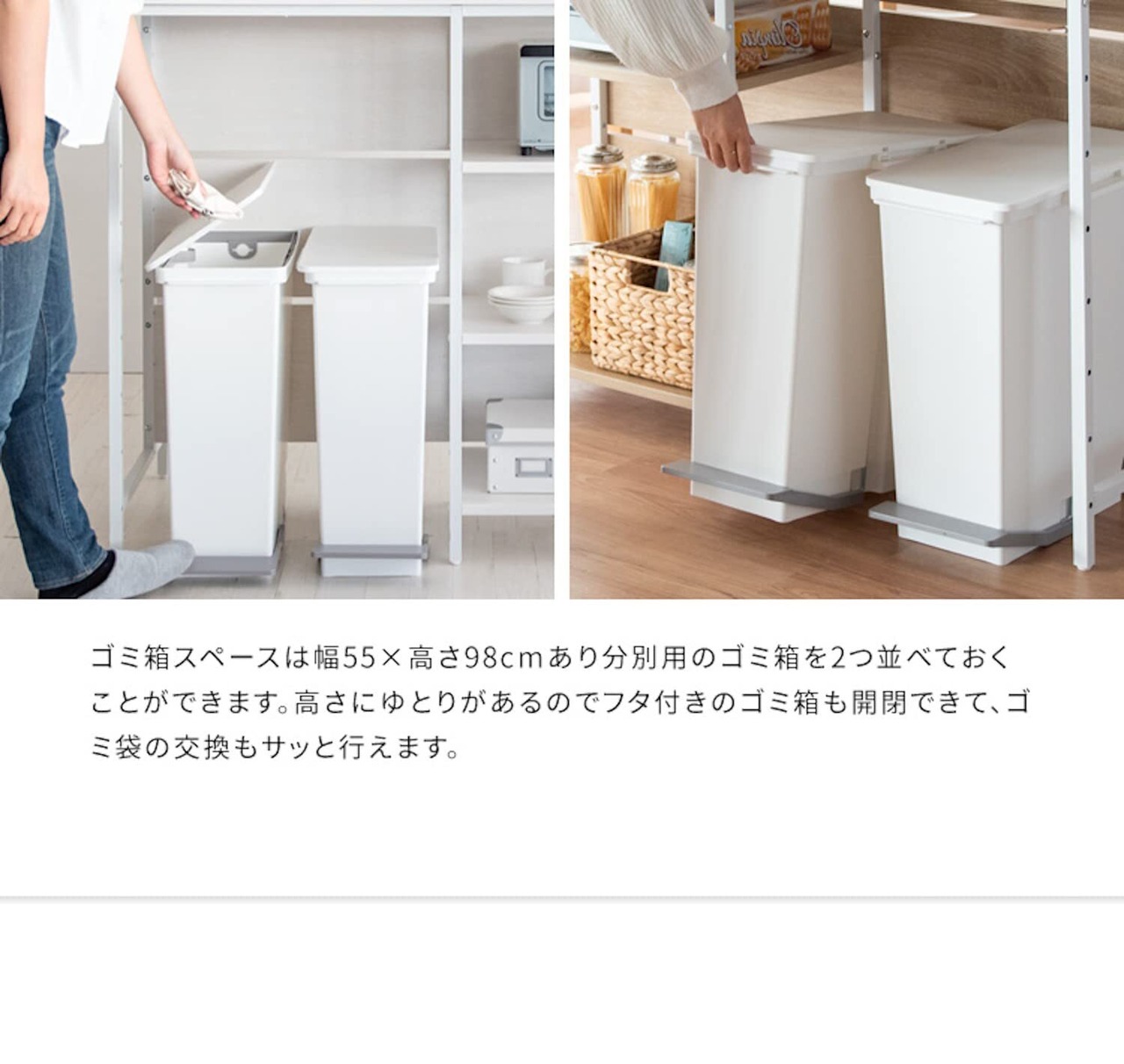 無駄なく収納できる可動棚のラックは電子レンジやトースターなどの家電も置けます。ゴミ箱スペースはフタ付きのゴミ箱を並べられてゴミ捨ても快適。