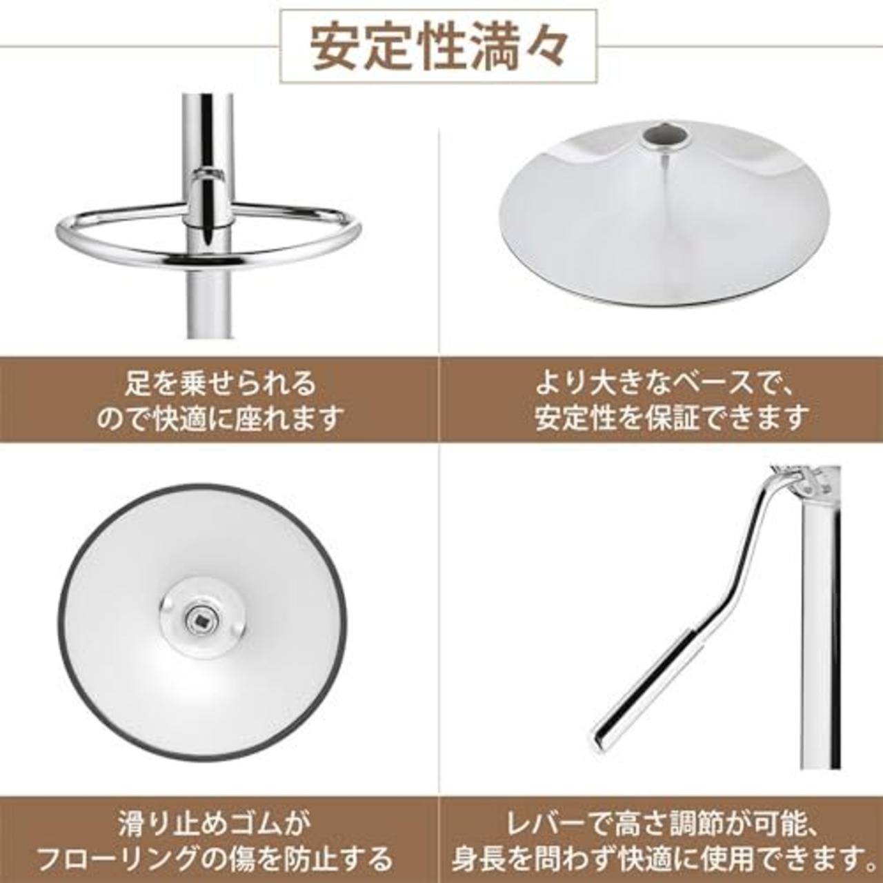 【昇降式&360°回転】昇降機能を備えており、テーブルないしカウンターの高さや身長に合わせて高さを調節できます。かつ、360°回転するため、方向転換や立ち座りをスムーズに行えるのも便利です。