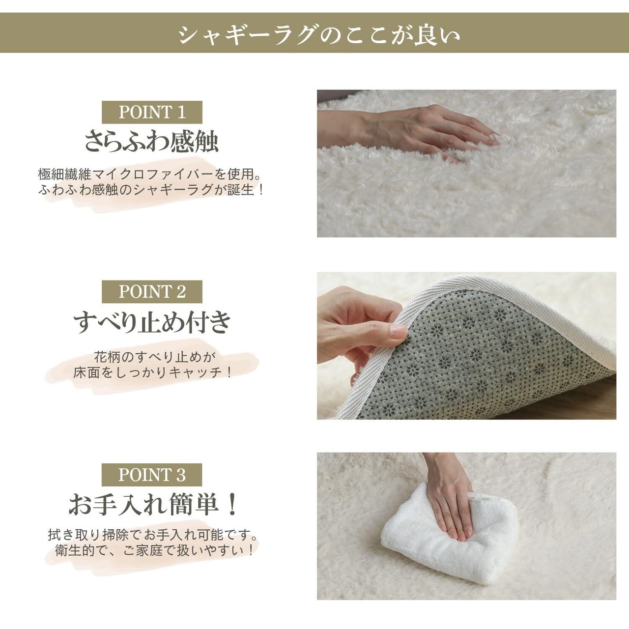 ・【商品の特徴】ふわふわシャギー、オシャレなカラー、ラビットファーのような手触り、お手入れ簡単、毛が抜けにくい、滑り止め付き、ホットカーペット対応、床暖房対応、オールシーズン、手洗い可能
