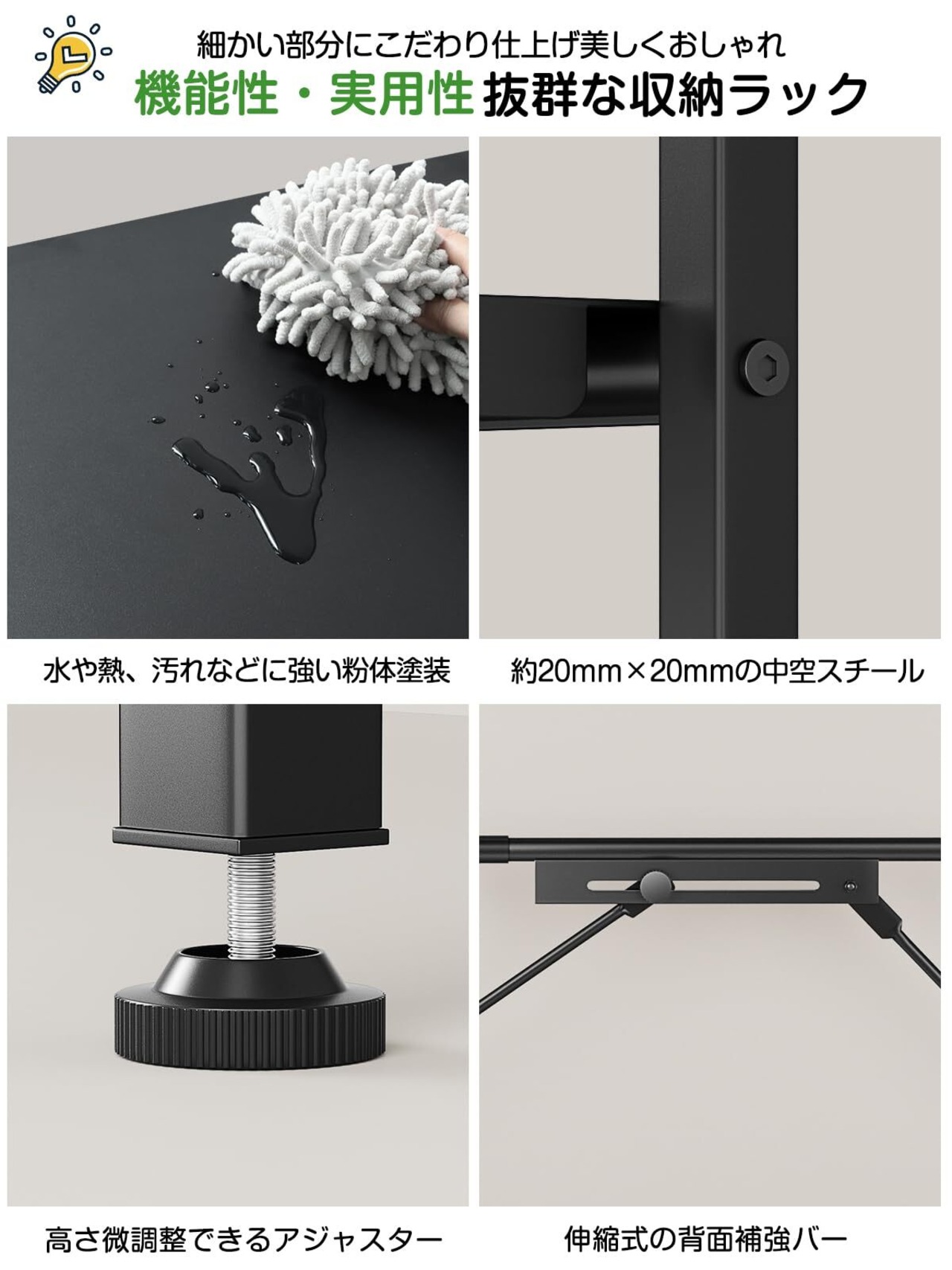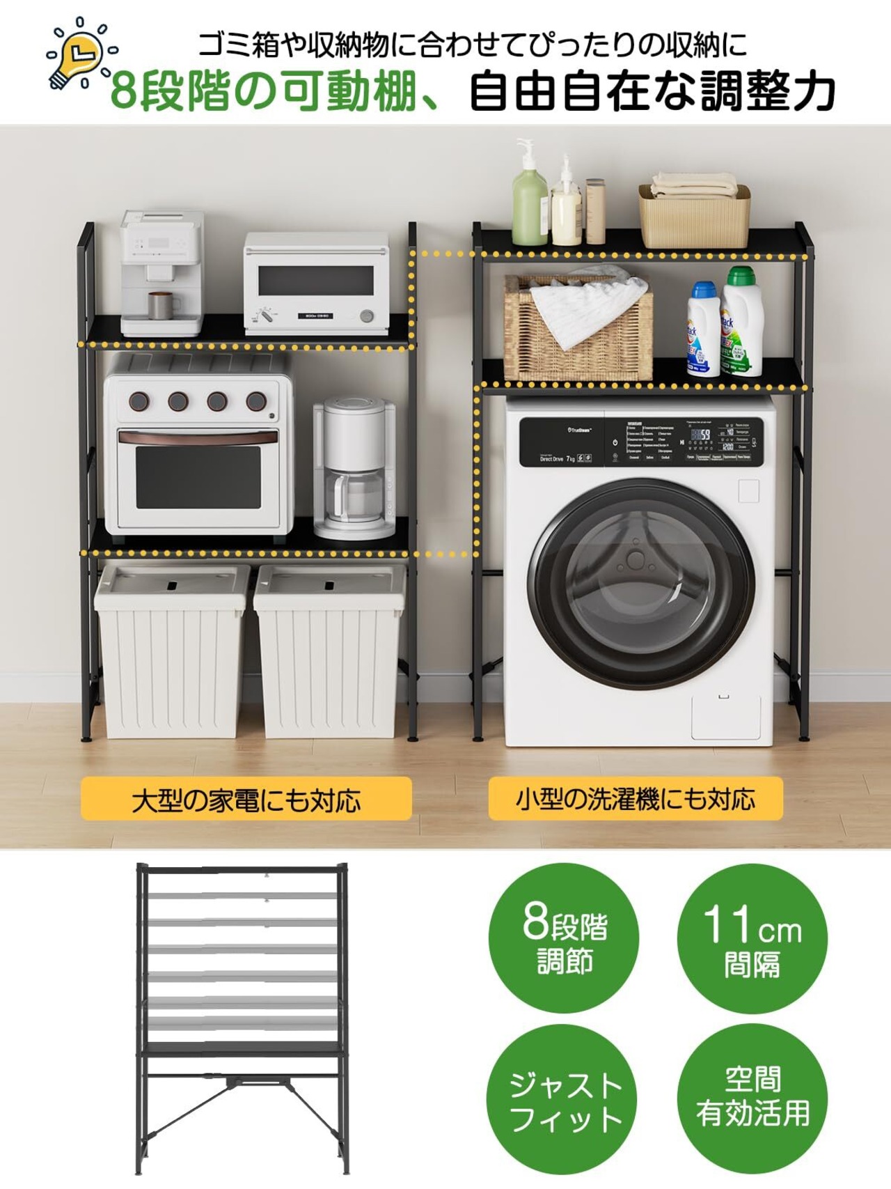 【上下高さ8段階調整】 レンジラックとしても収納物に合わせた棚調整で可動棚を採用しました。食器・調理器具・キッチン家電・食品ストックなど幅広い収納物に柔軟に対応いたします。高さのある家電類や背の低い食器類の収納も無駄を作らず収納可能。使う方の身長に合わせた棚板調整もでき、キッチン周りをスッキリと!キッチンボード