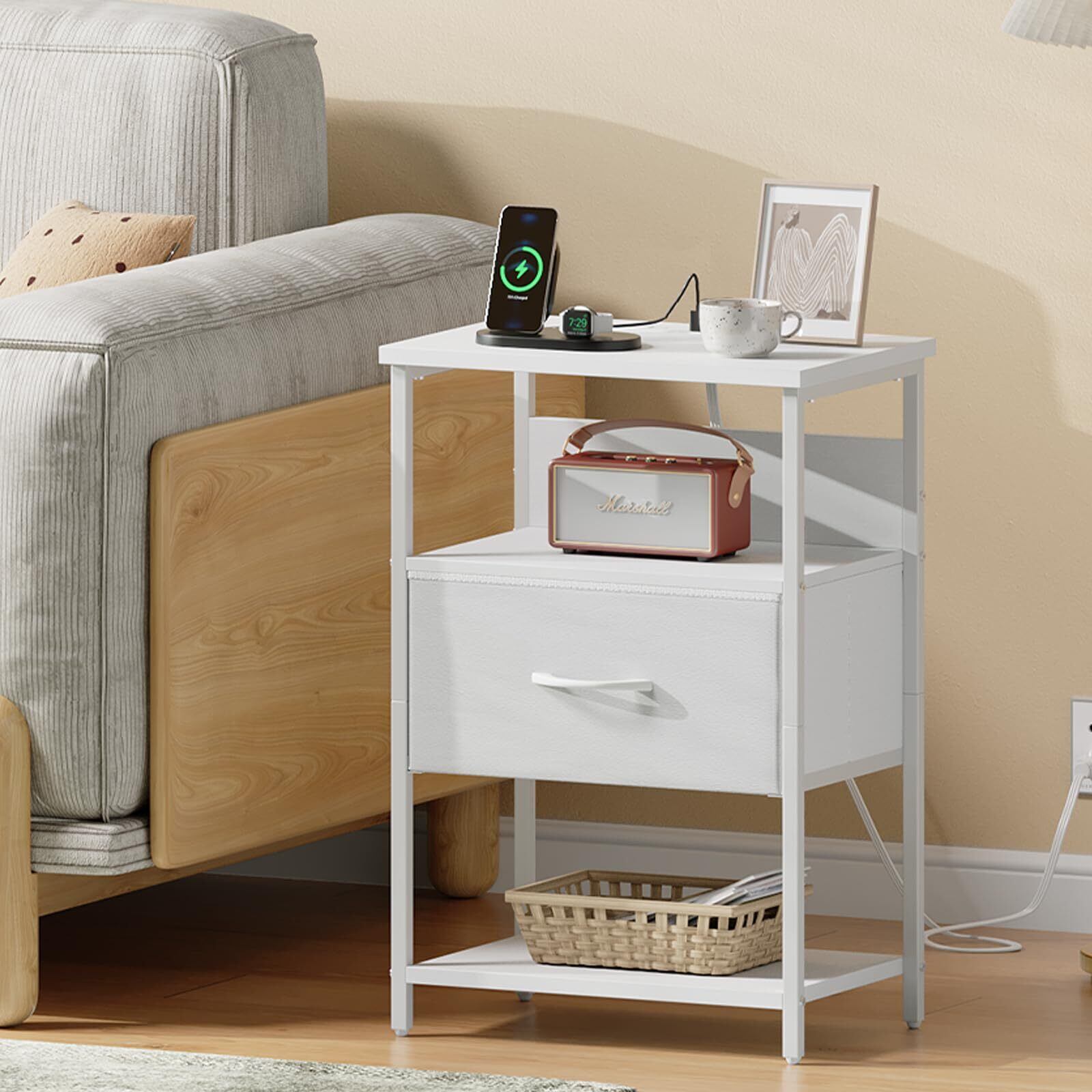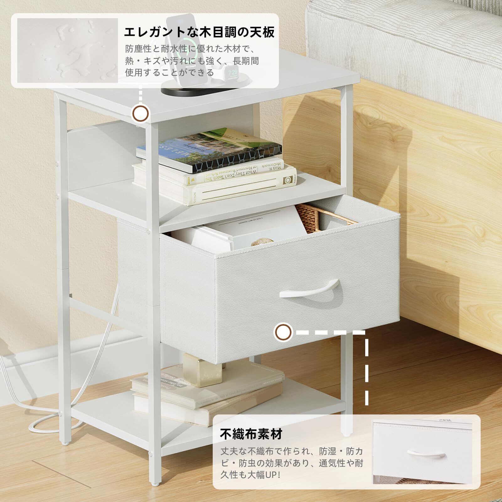 Somdot ベッドサイドテーブル サイドテーブル ナイトテーブル LED night table チェスト タンス 収納 おしゃれ USBポート&コンセント付き 3段オープン棚付き 引き出し 幅40 奥行30 高60 布製 リビング ソファー 一人暮らし ホワイト