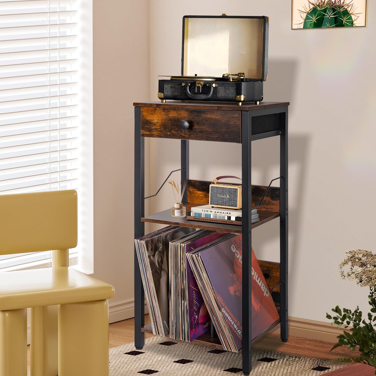 【多機能収納】このレコードラックは3段構成で、コンパクトで合理的な構造で、開放的な設計で、記憶空間が大きく、2つのレコードプレーヤーを収納でき、さらに100枚のレコードと各種メディア必需品を収納でき、引き出しには小物を収納できる。板面は滑らかで防水性があり、オフィス、寝室、キッチン、書斎に最適です。また、物置棚、植物棚、浴室棚などとして、物置需要を満たすことができる。