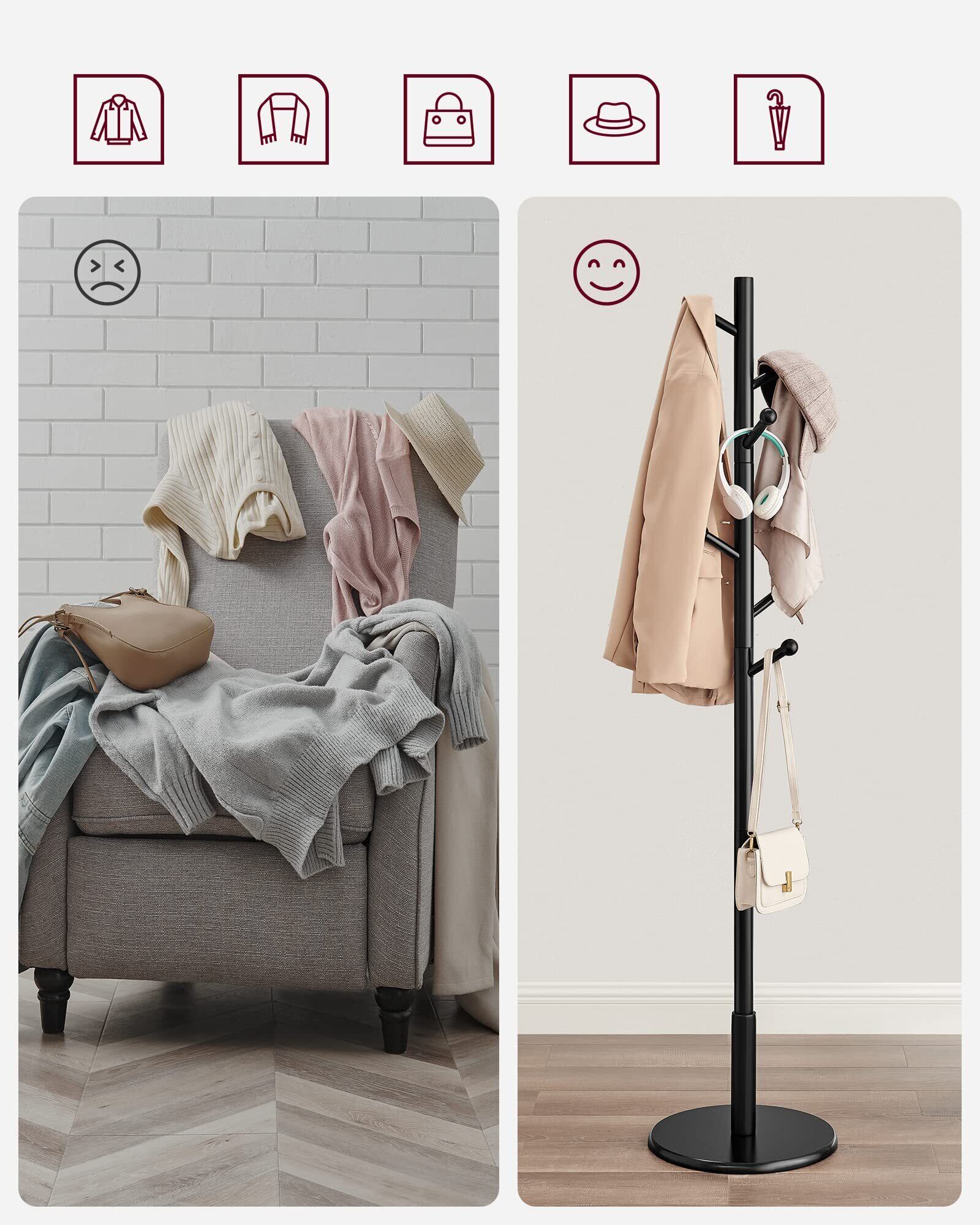 【組み立てはシンプルです】: 複雑な組み立てに悩まされていませんか? これは違います。 ポールを丸いベースに取り付け、枝をねじ込むだけです。 あなたの服はこのコートラックに数分でかけられます。