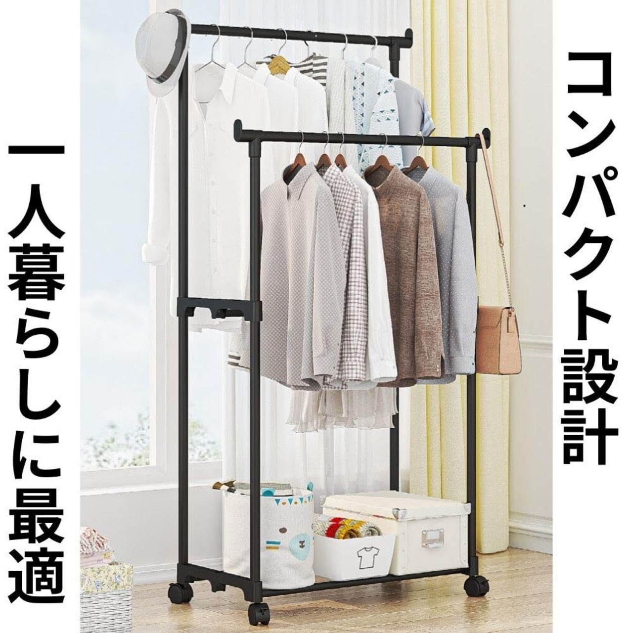 D.Stomo ハンガーラック ダブル 2段 キャスター付き ちょい掛け用 小さめサイズ 総耐荷重 省スペース 移動楽々 組み立て簡単 単身向け (ブラック)