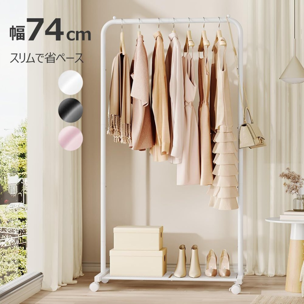 【スリムで大収納】幅74cmで、一人暮らしの衣類収納、玄関のコートハンガー、部屋の物干し、会社の更衣室などの業務用まで、幅広くお使いいただけます。下にはメッシュ棚が付いているので、棚に収納ボックスや靴等も収納できます。