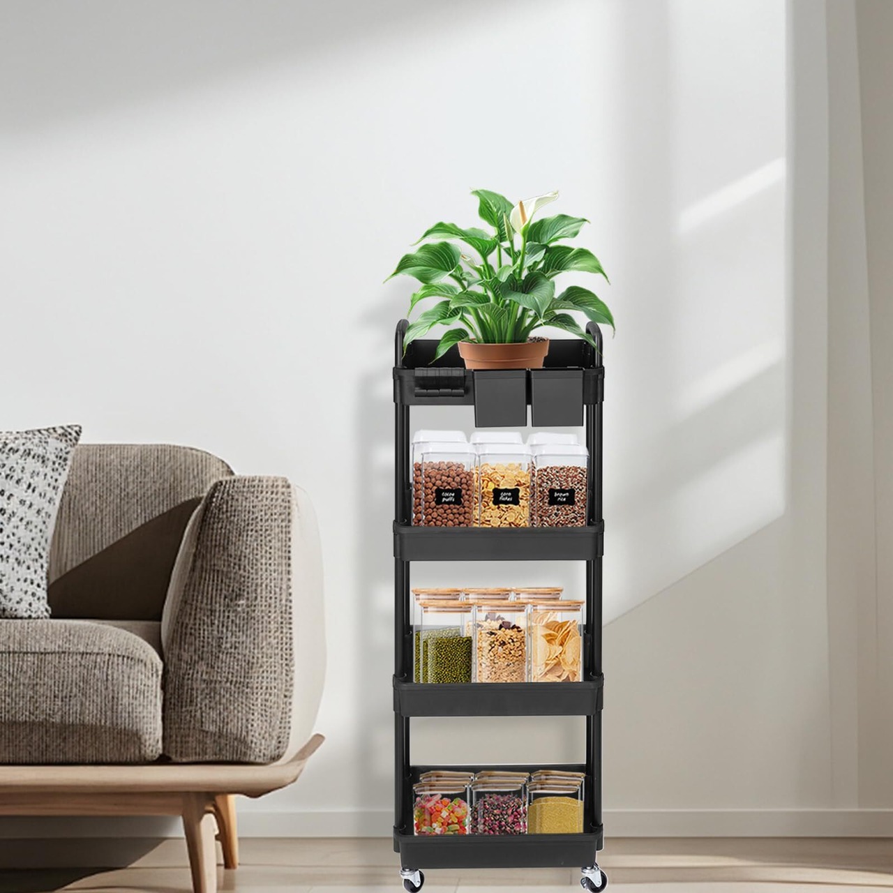 SIUSA キッチンワゴン ワゴン キャスター付き 5段 スリム 収納ワゴン 大容量 収納カート ハンドル/収納カップ付き ペットボトル収納 洗面所 台所 トイレ 浴室 冷蔵庫横 組立簡単 幅38×奥行27×高さ130cm ブラック