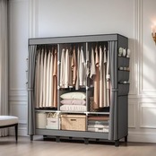 多功能収納: このポータブルな衣装ラックは十分な収納スペースを提供しています。衣装ラックは上下 2 つの部分に分かれています。上部には 2 本のハンガーバーが設けられており、長いコート、上着、セーターなどを簡単に吊るすことができます。下部には 6 つの収納棚があり、折り畳んだ衣類、ハンドバッグ、帽子などを置くスペースとなっています。 両側には 18 個のポケットが設けられており、手袋、スカーフ、靴下などの小物を便利に保管することができます。特に、底部を密封構造にしているのは配慮深いデザインです。従来のクローゼットと比べて、塵や水しぶきをより効果的に遮断し、常に清潔な状態を保つことができます。