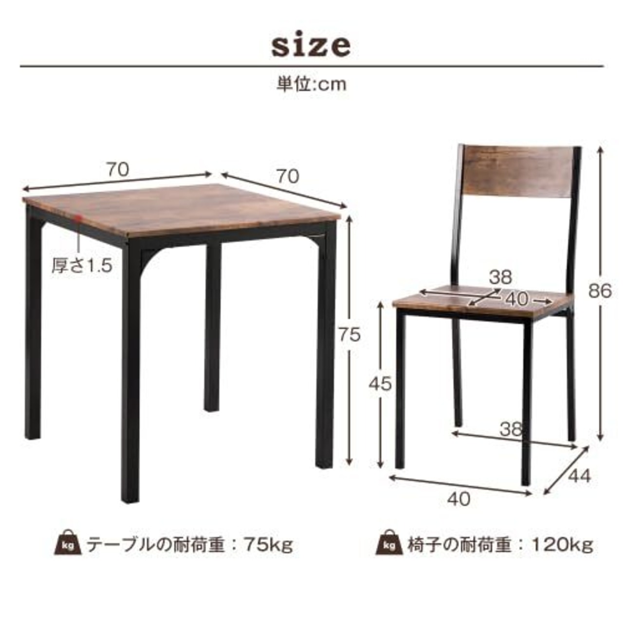 円形テーブル1卓と椅子2脚のセット お部屋の空間を邪魔せずに、でもお料理もたくさん載せられる、ちょうどいいテーブルセットです。ご夫婦で使用するにもぴったりのサイズです。 幅約53cmのコンパクトサイズで場所を取りません。 お店のカフェスペースを思わせるオシャレなデザイン。 単身もしくは二人暮らしなど、 “ダイニングで場所を取りたくないけど 食事のスペースが欲しい” という方におすすめのダイニングセットです。 椅子1脚の重量は約3kg、テーブル1卓の重量は約6.51kgとなっており、女性でも簡単に運べます。 PVC塗装は丈夫で汚れにも強く、汚れても布でサッと拭き取るだけでお手入れも簡単。 テーブルの脚部分には強度を上げるためのバーを設置。 テーブルの下には、雑誌などのちょっとした日用品を収納できるスペースをつけました。 フレーム部分は紫外線による色褪せやサビ付きを防ぐためにパウダーコーティングを施しています。