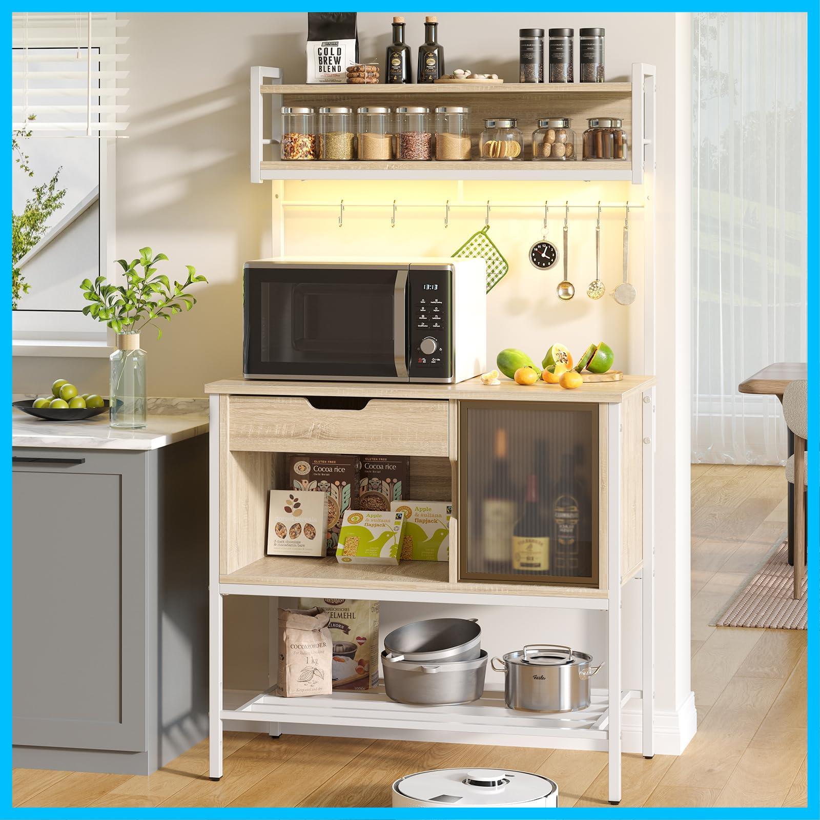 【特価セール】Bestier レンジ台 幅86cmレンジラック 5段式キッチンラック 大型電子レンジ対応 幅86×奥⾏41.6×⾼さ150cm 引き出し付き 扉収納 LEDライト照明S字フック付8個 省スペース(オーク)