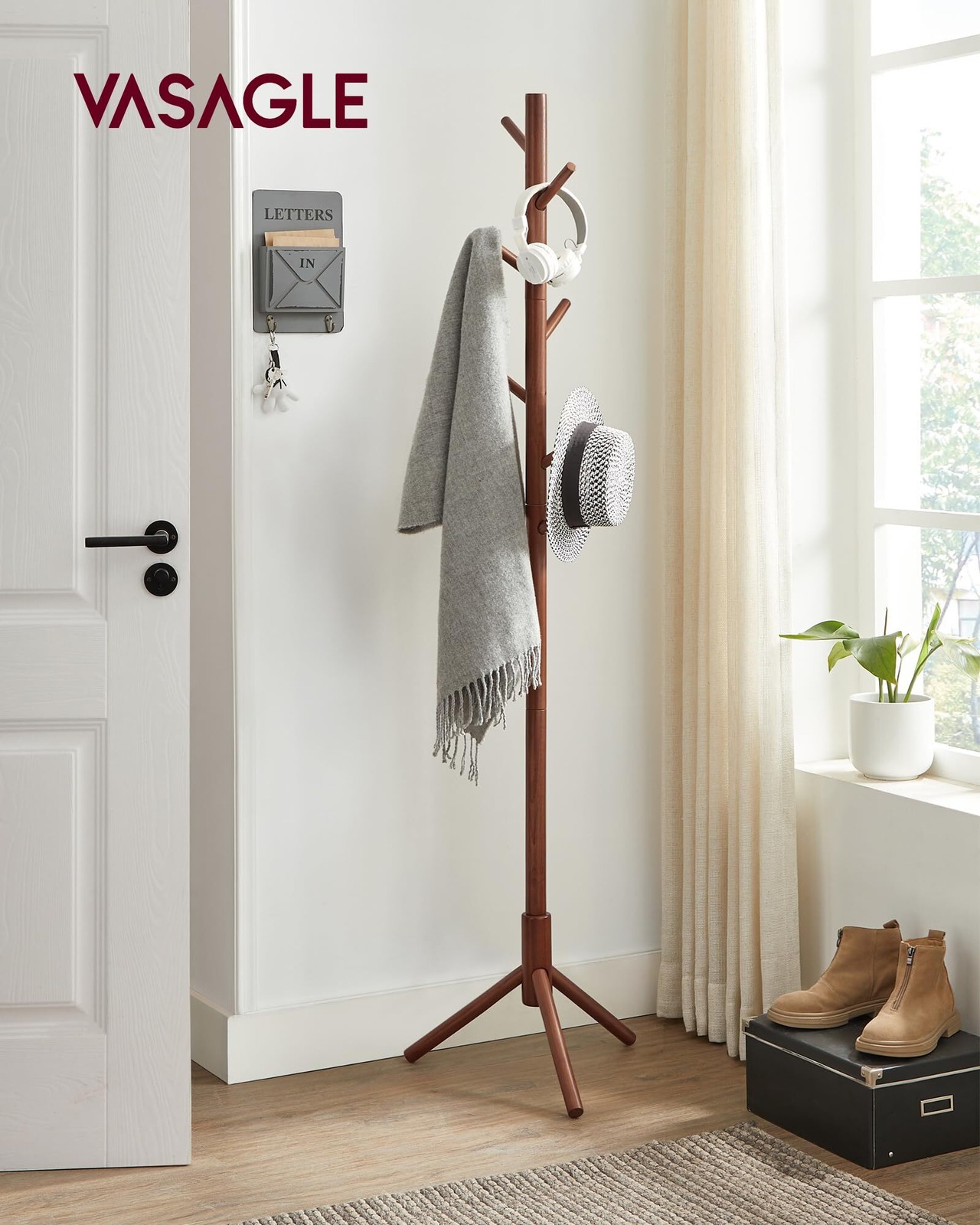VASAGLE ポールハンガー おしゃれ 木製 スリム 頑丈 コートハンガー キッズ 玄関 ハンガーポール コート掛け 帽子掛け スタンド バッグスタンド 服掛け バッグ掛け 上着掛け ハンガーラック カバー掛け 服かけスタンド 落ちにくい 胡桃色 47x47x175cm RCR04WN