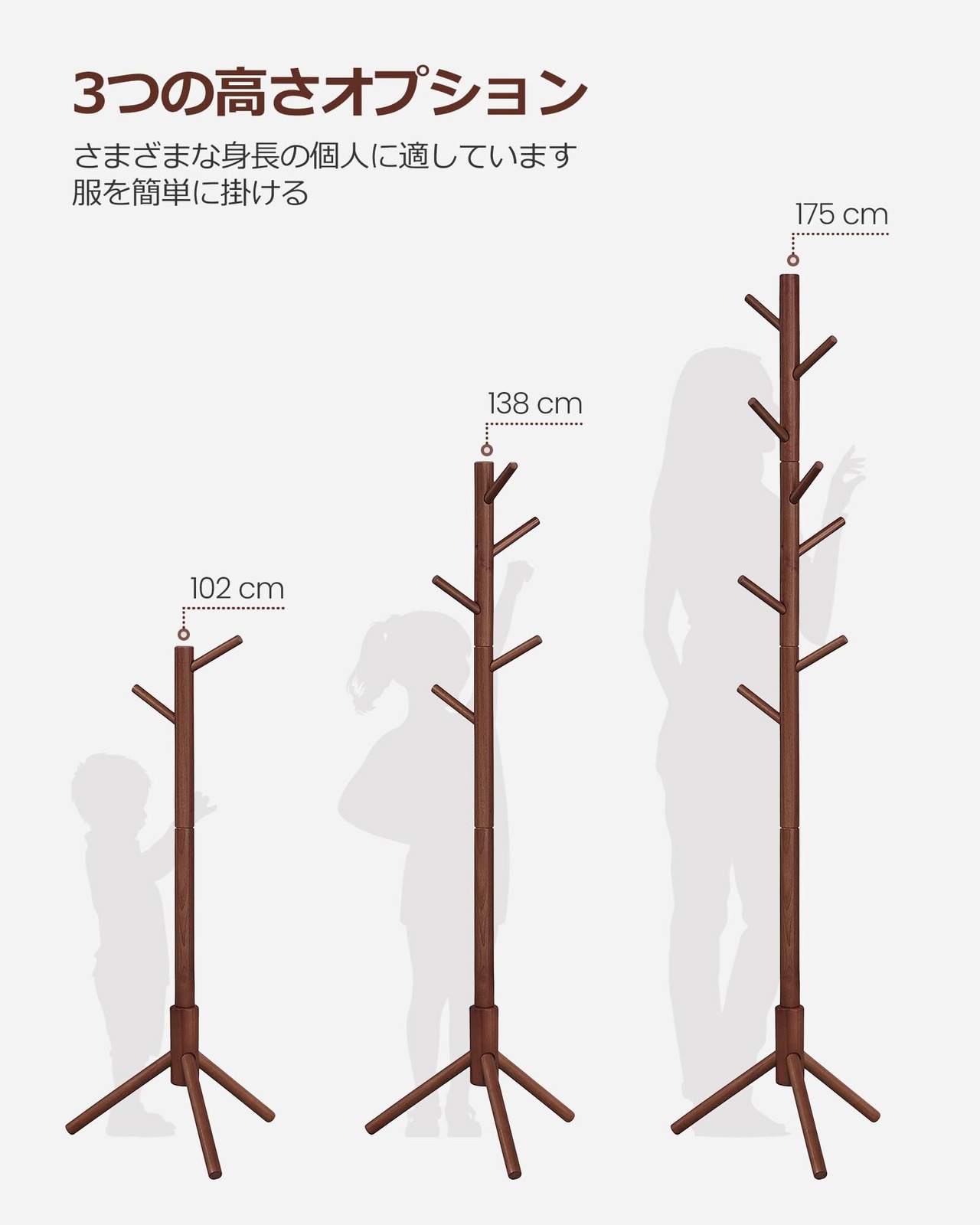 【人気商品】VASAGLE ポールハンガー おしゃれ 木製 スリム 頑丈 コートハンガー キッズ 玄関 ハンガーポール コート掛け 帽子掛け スタンド バッグスタンド 服掛け バッグ掛け 上着掛け ハンガーラック カバー掛け 服かけスタンド 落ちにくい 胡桃色 47x47x175cm RCR04WN