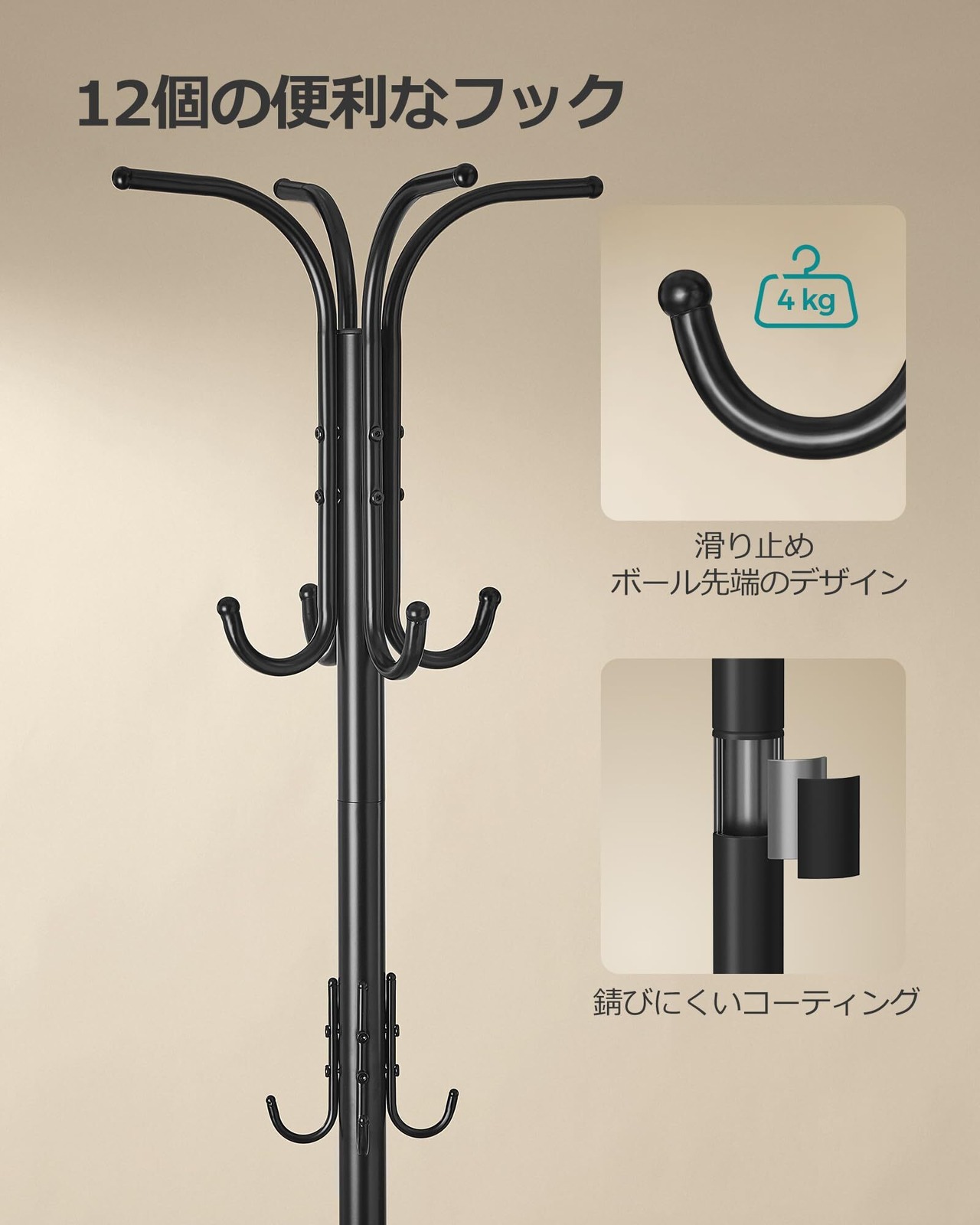 【簡単に掛ける】4本の頑丈な脚と低く安定した重心を備えたこのコートラックは、12本の頑丈なフック(各フックは最大3Kgまで保持可能)に重いコートやバッグを自信を持って掛けることができ、アイテムがしっかりと安全に保持されることを保証します。