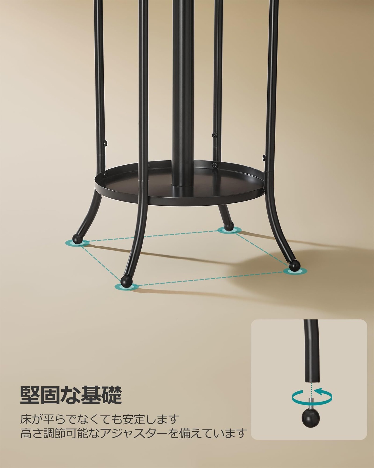【安定性向上】この独立式コートラックの4つのボール状の調節可能なアジャスターは、追加の安定性を提供し、わずかに不均等な床でもバランスを保つことを確実にします。