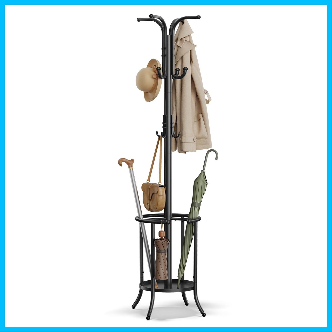 【特価商品】SONGMICS ポールハンガー コートラック フリースタンディング、傘立て付きコートラック 12フック付き メタルコートラックスタンド 玄関 廊下 リビングルーム 寝室用 インクブラック 40x40x175cm ブラック RCR011B01