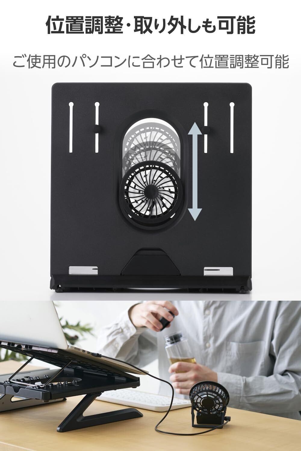 スタンドの中央付近に、ノートパソコンの過熱を防ぐ冷却ファンを搭載。冷やしたい場所に合わせて、上下に位置を調節可能です。