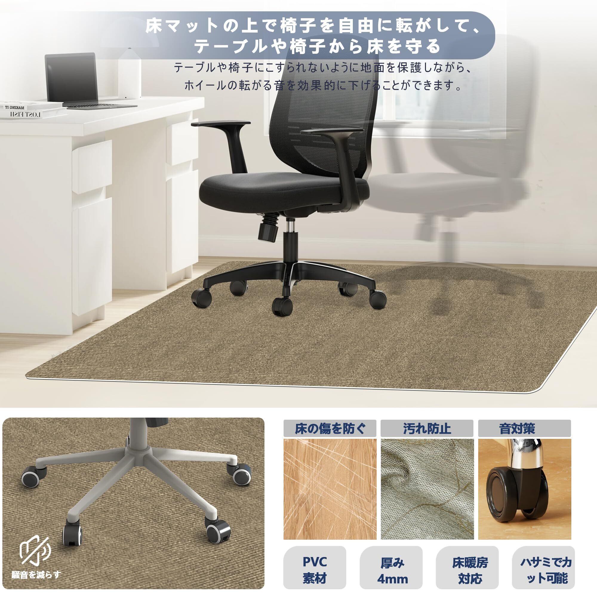 【騒音を軽減・傷防止デスクチェアマット】キャスターの動きによるノイズを効果的に低減し、階下の居住者と静かで快適な環境を作り出す、吸音・ノイズリダクションのチェアマットです。 ;厚さは4cmで、家具やキャスターによる傷から床を保護することができ、新築住宅や賃貸アパートに適しています