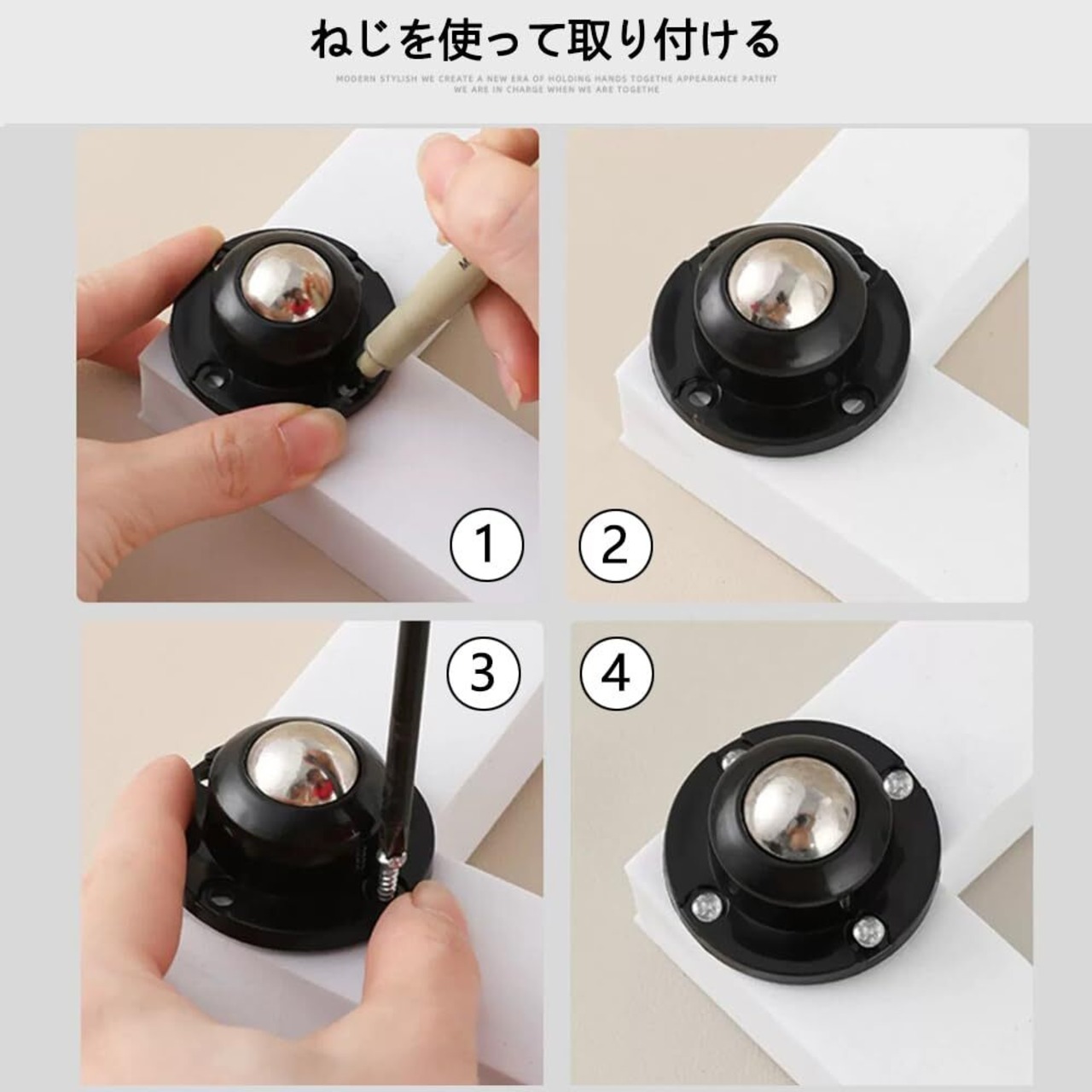 【簡単な取り付け】キャスターの取り付けは簡単!キャスターと家具に順番にテープを貼るだけです!また、滑らかな面に貼り付ける際は、凸凹のない表面に取り付けるか、ネジで固定してください。