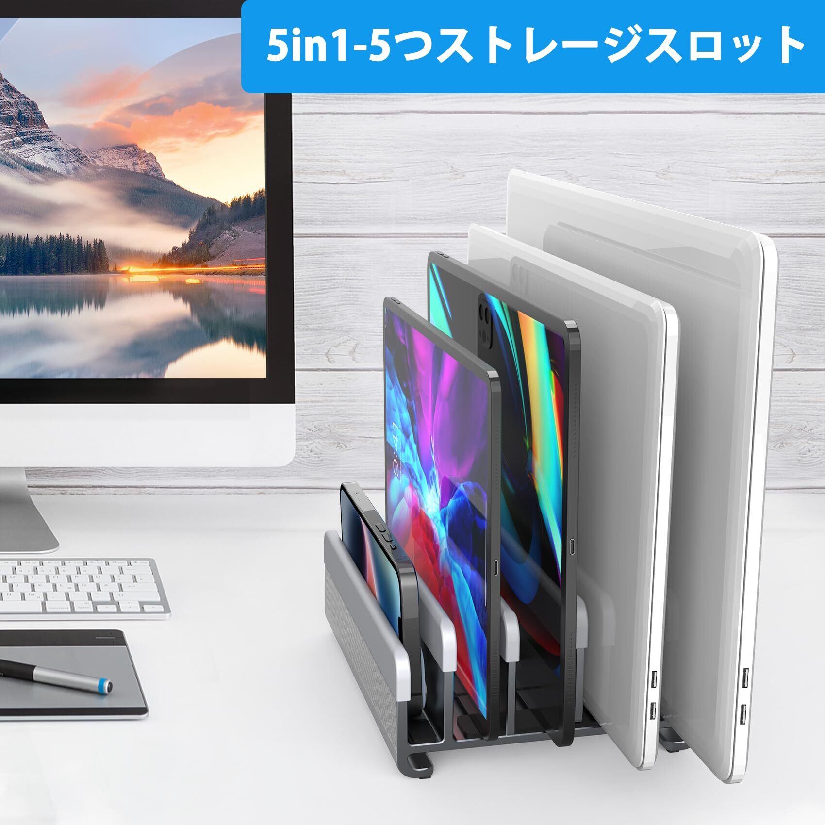 【最新版&5in1を実現】PC/タブレットPCを4台同時ストレージが可能に!それ以外、サイドにはスマホを収納できます。 当社のノートPCオーガナイザーは、3つのスライド式スタンドがあり、厚さの異なるノートPCを最大4台まで収納できるよう調整できます。 複数のノートPCを収納するのに最適なノートPC収納スタンドです。