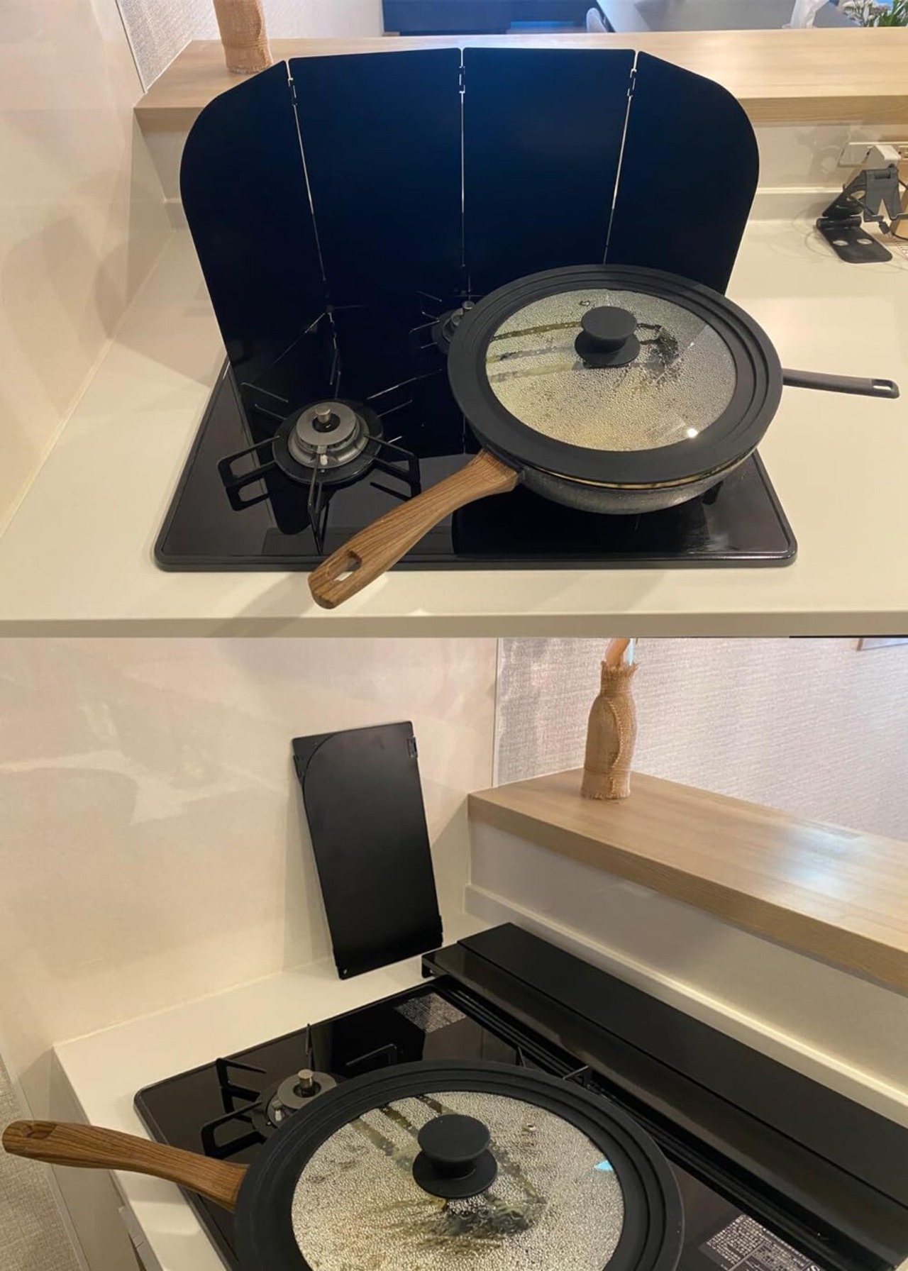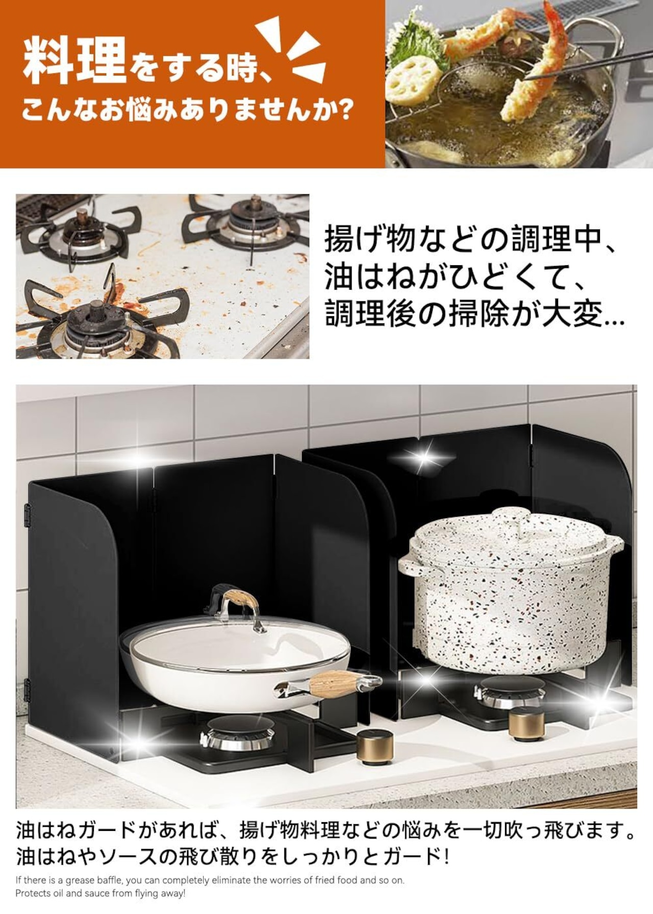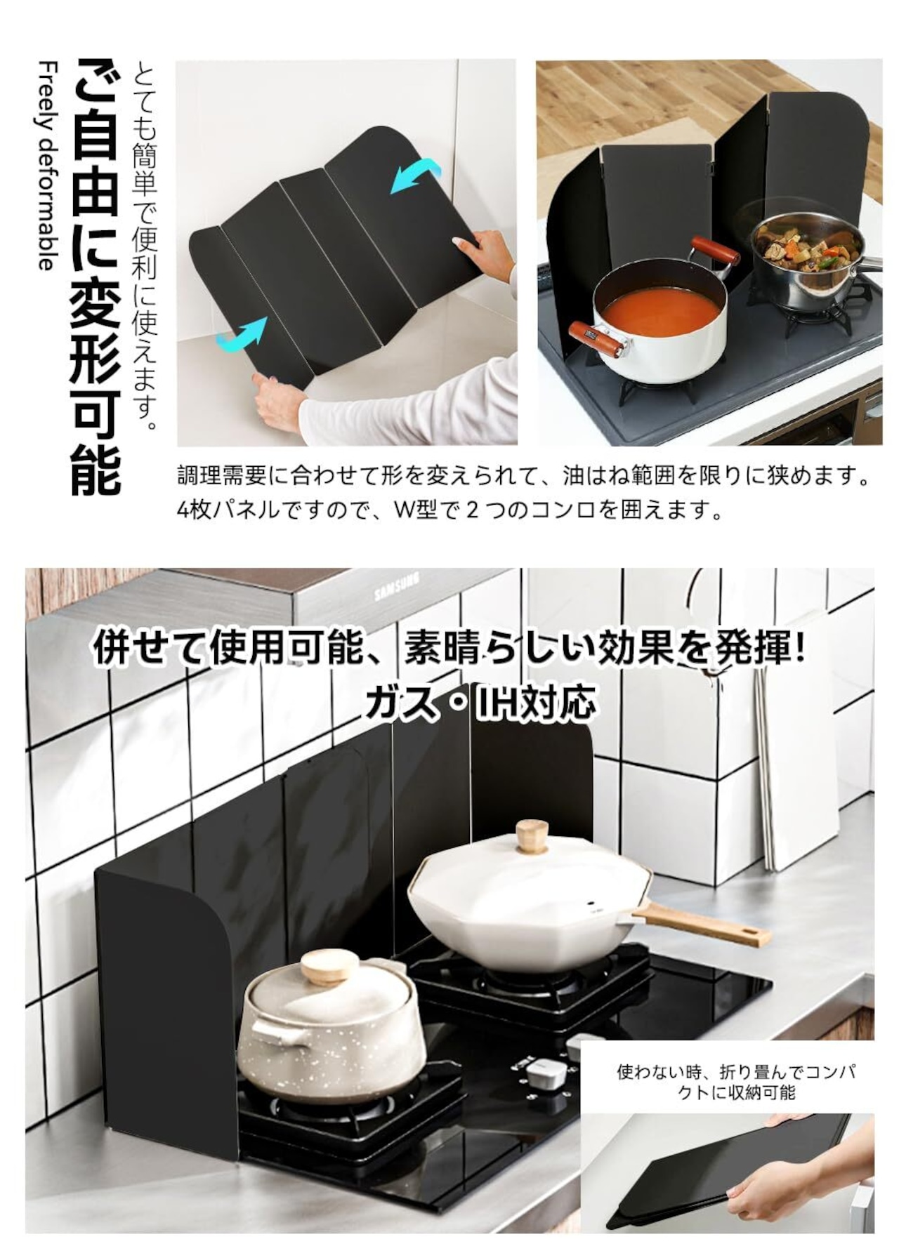 【4枚パネル·油はね防止】油はねガードは調理の需要によって、サイズと形が自由に変えられる便利な4枚パネルでコンロを良く囲って、キッチンの壁に飛び散る料理の油汚れや汁はねなどを逃しません。天麩羅鍋を囲った時の油はね実験にて、飛び散る油を93%以上防ぎました!本製品を使用すれば、いつの間にか壁が汚れてしますということも無くなります。