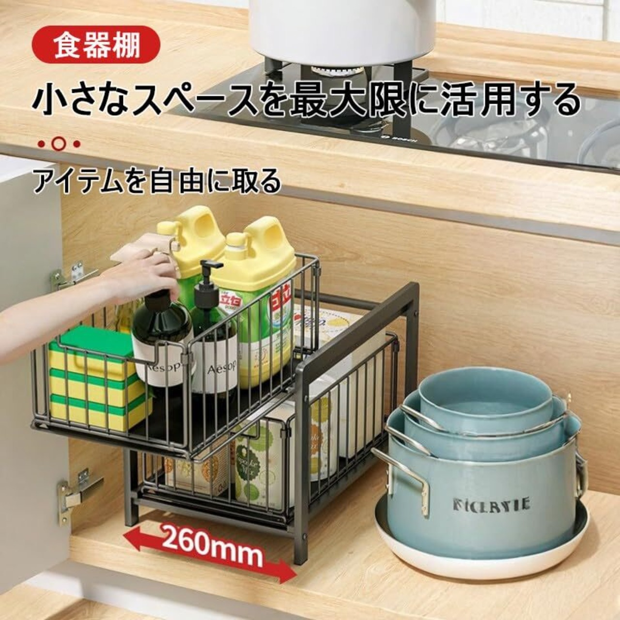 【シンク下収納を有効活用】 デッドスペースになりがちなシンク下を、すっきり整理整頓! 散らかりがちな日用品やストック品も、スマートに収納でき、毎日のキッチン作業が快適になります