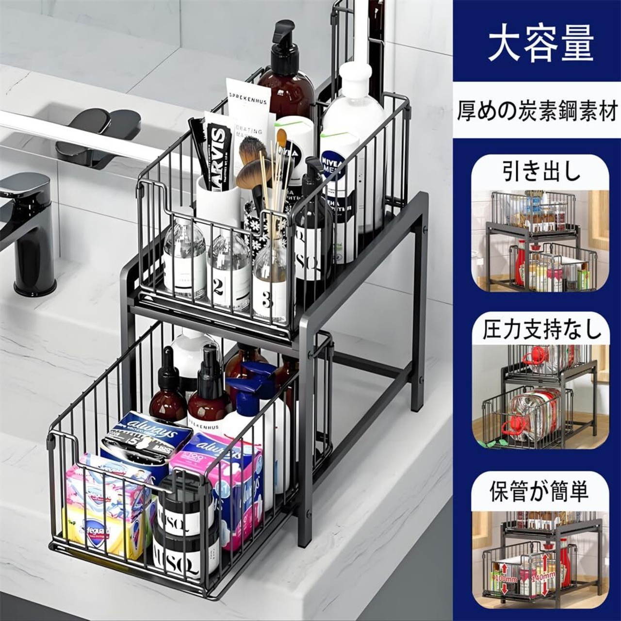 【在庫処分】シンク下 収納 引き出し スライド しんくした収納ラック 引き出し 大容量 2段 キッチンシンク下収納ラック キッチンラック キッチン収納ラック 洗面台下 収納 シンク下 組立簡単 幅26×奥行き37×高さ38.5cm 省スペース ブラック [並行輸入品]