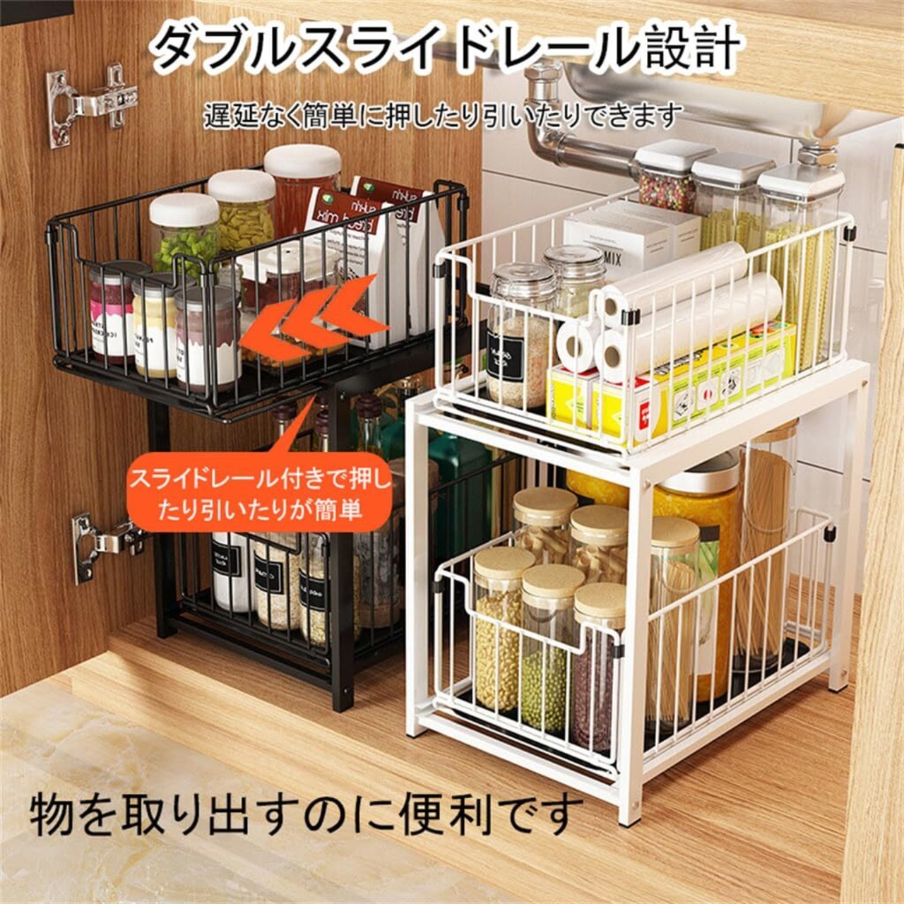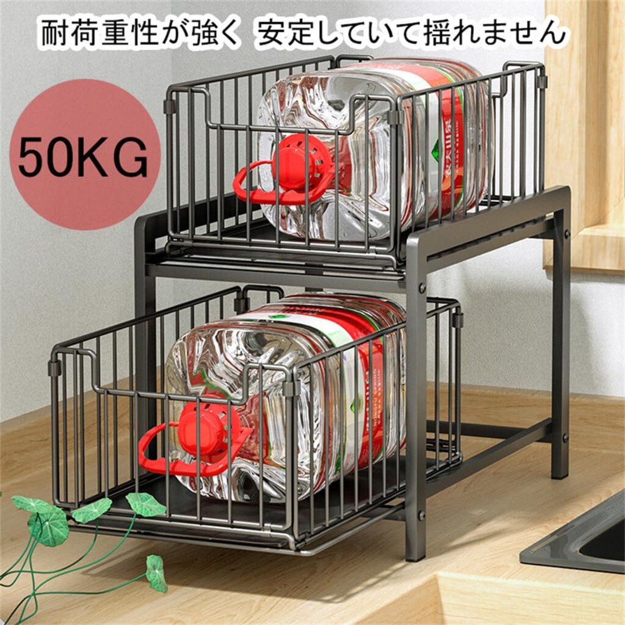 【スライド式で取り出し簡単】 奥行きをしっかり活かせるスライドレール付きの引き出し構造。調味料・洗剤のストック・小物類などの出し入れがスムーズで、キッチン収納力がぐんとアップ!