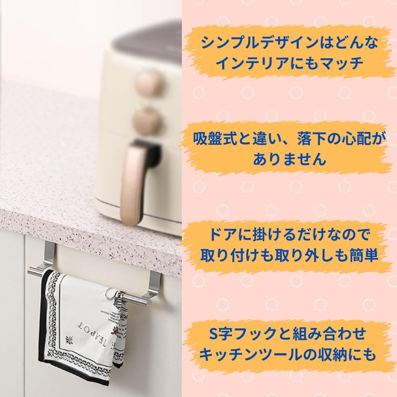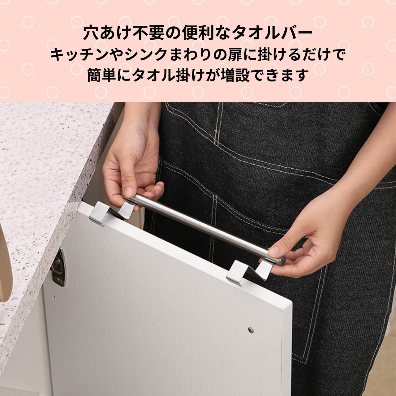 多用途活用:タオル掛けだけでなく、キッチンツールや手袋の収納にも活躍。扉内外どちらでも便利!