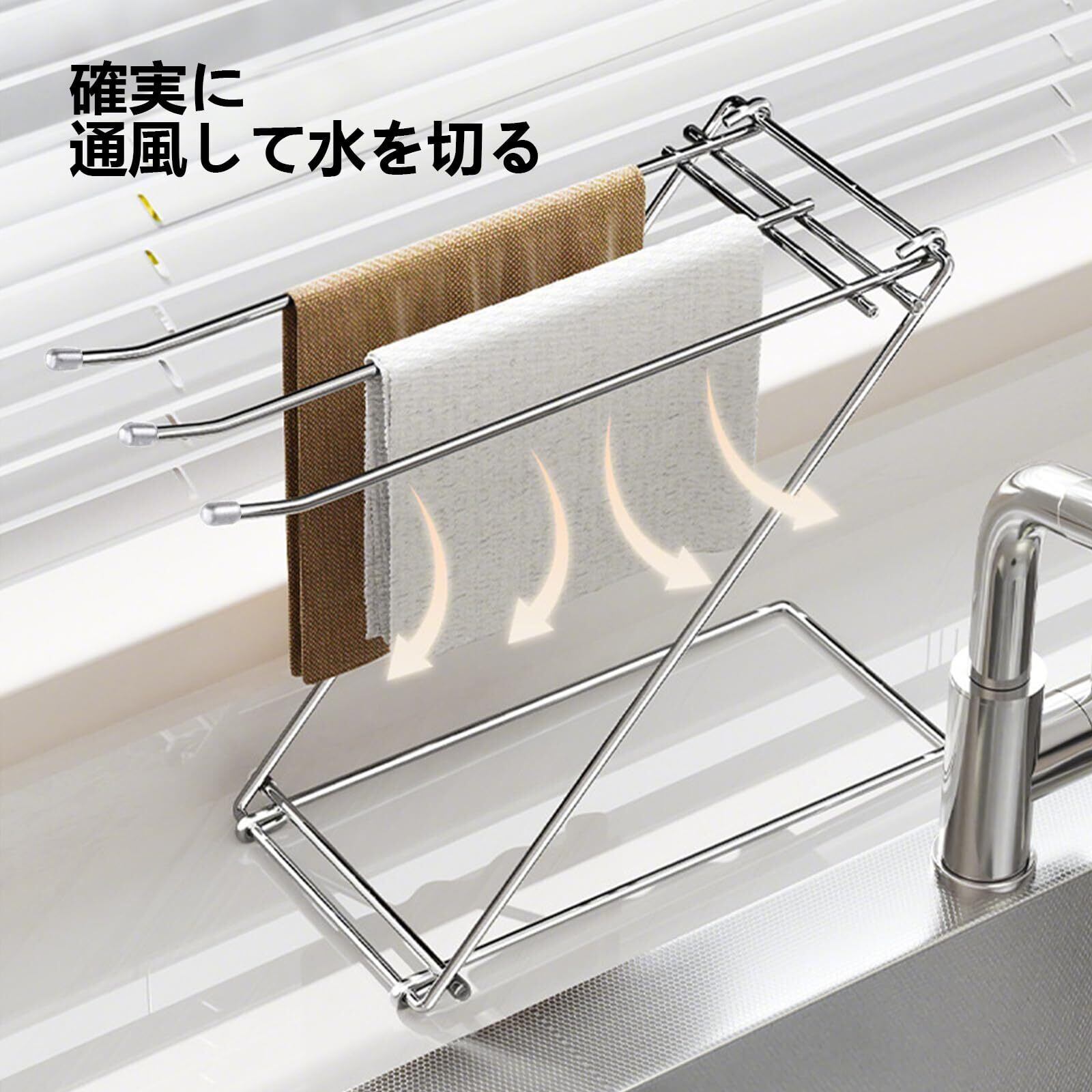 【高品質素材】ステンレス製なのでカビにくく軽いので使いやすい。ふきんを置くのに便利だ。安定して立てられます。キッチンまわりをスッキリ整理収納。スペースを有効利用できます。シンプルでインテリアの邪魔にならず、強度もしっかりしていて、たわみもありません