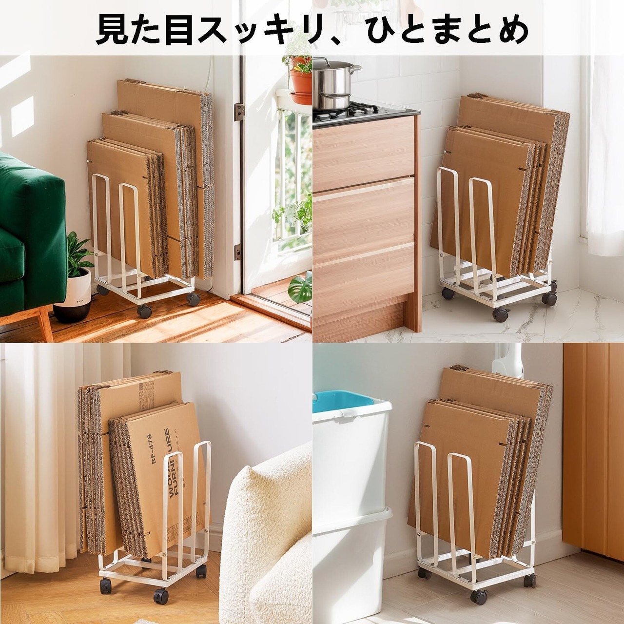 スッキリ収納:どうしても場所をとるダンボールを簡単スリムにストック。一時保管やゴミ捨ての際などにも便利です。ネットショッピングなどでたまりがちなダンボールを省スペースに。