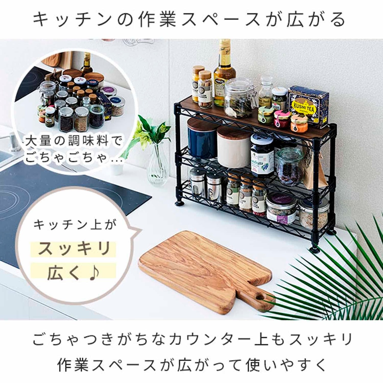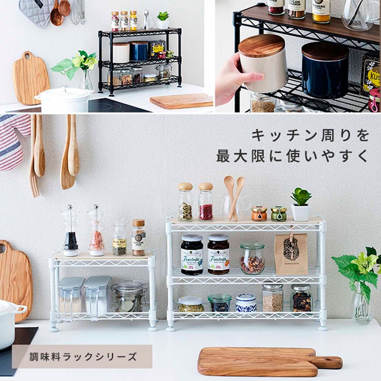 高さが変えれて組立簡単!スパイスや調味料をおしゃれにひとまとめ。コンロ横やキッチンカウンター上をスッキリ整理。ホワイト・ブラックの2色展開