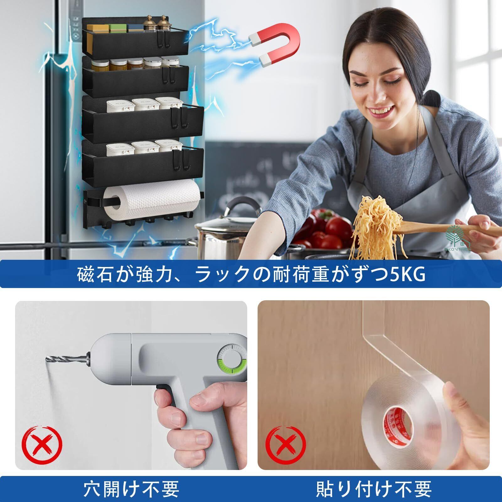 【新着商品】Skovtree 調味料ラック マグネット式 5点セット 冷蔵庫サイドラック スパイスラック キッチン収納用 マグネットペーパーホルダー付き ブラック