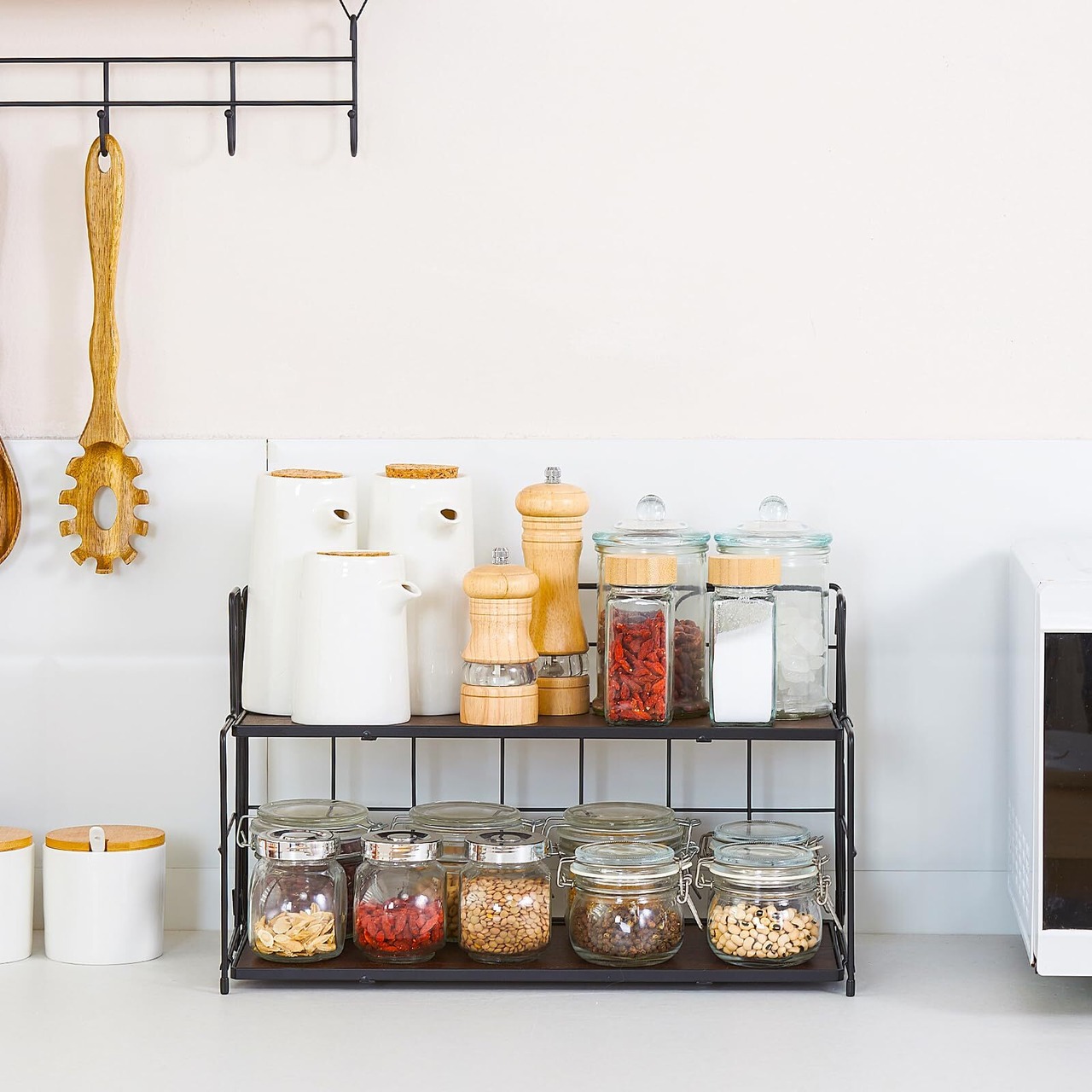 Edergoo 超高速ツールレスアセンブリ 卓上収納ラック 2段 折りたたみ式 調味料 化粧品 洗面所 デスク整理 キッチン&オフィスラック大容量 整理整頓 スッキリ(くるみ木色棚板+黑色フレーム)