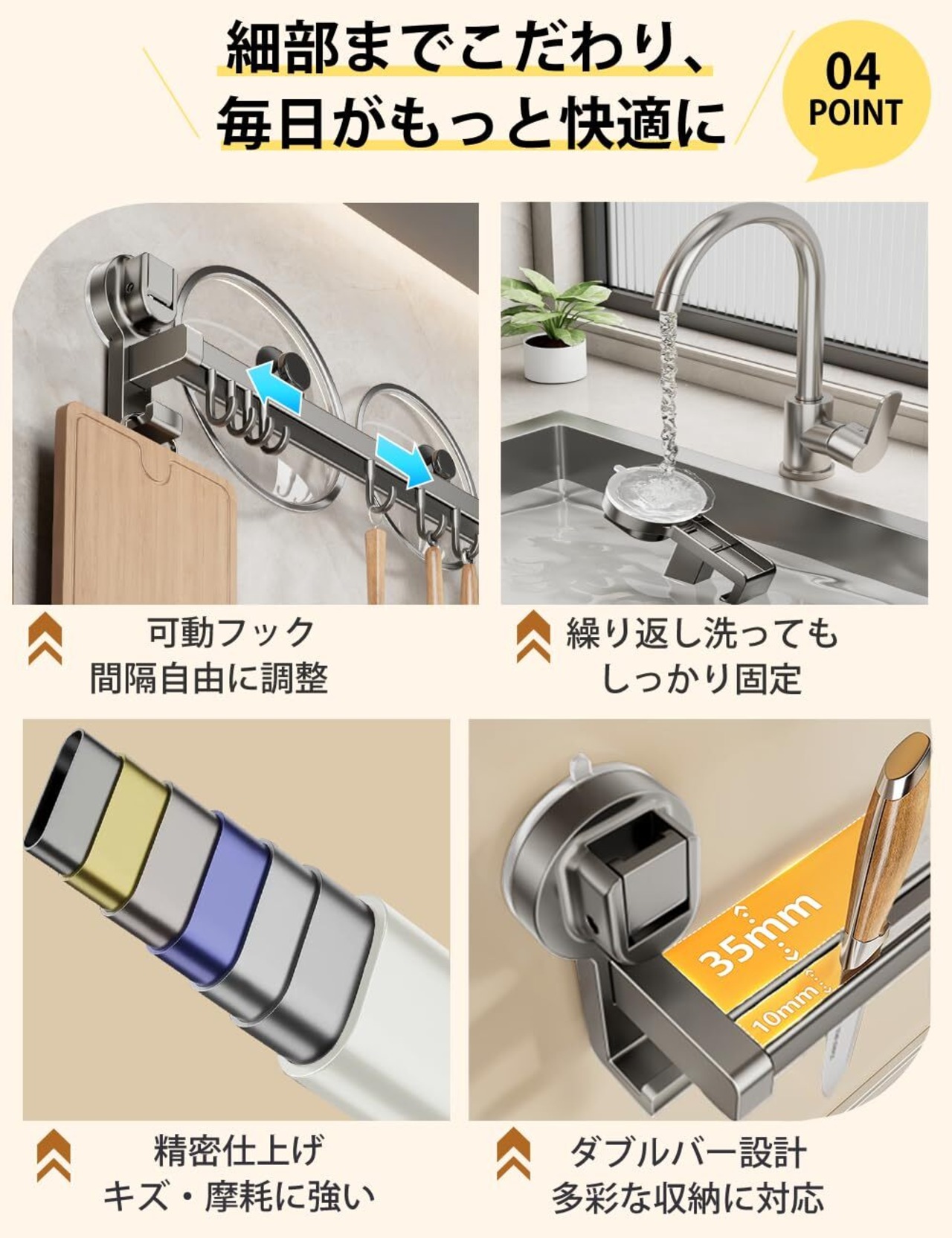 【業界トップクラスの吸着力】 プロも認める強力吸着!キッチン収納の新革命。押すだけでピタッと固定、穴あけ不要で壁を傷つけません。工具なしで簡単取り付け、すぐに使える。一瞬でスッキリ、家事がもっと快適に!