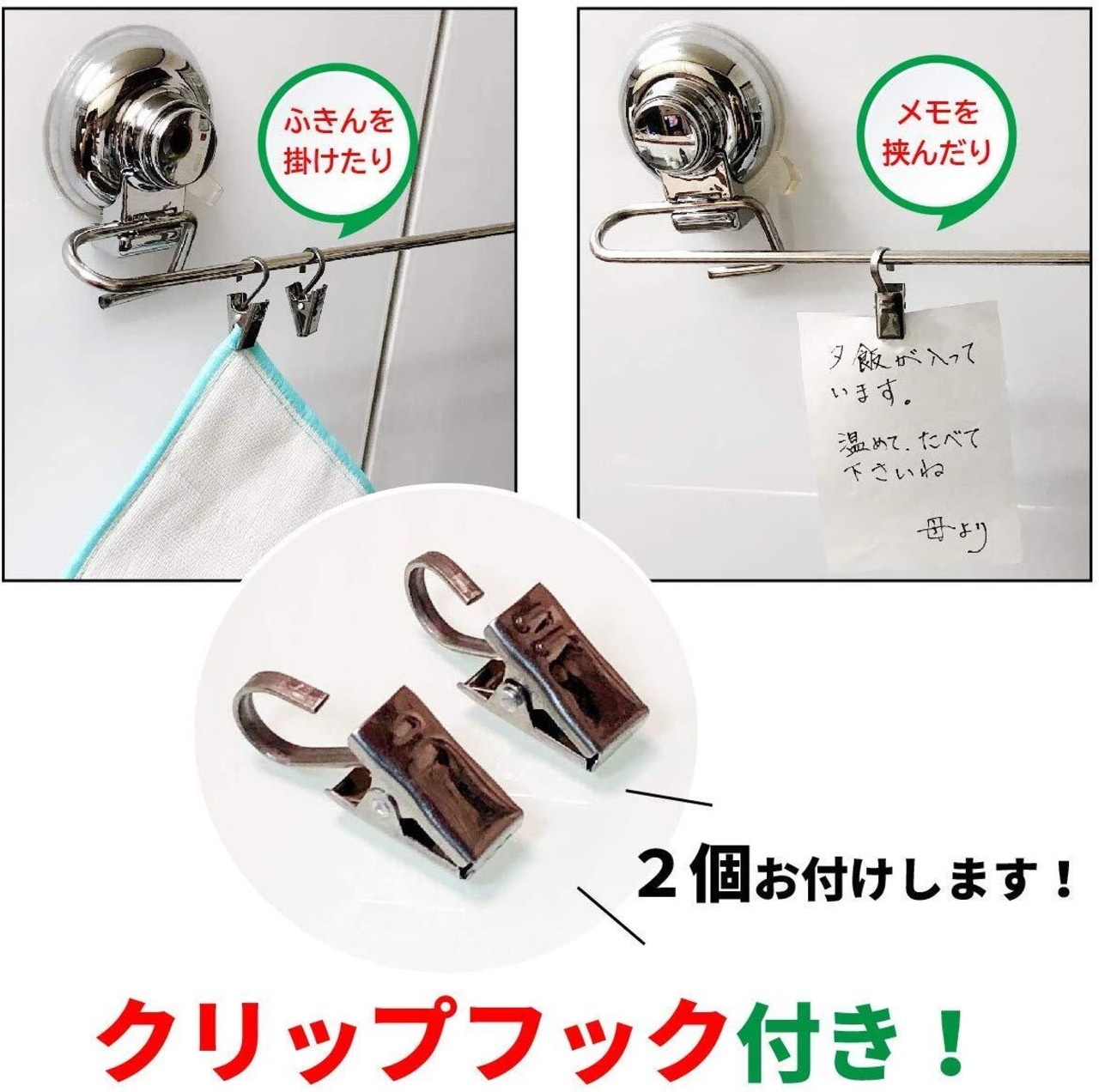 【嬉しいおまけ付き!】布巾やメモを引っ掛けるのに便利なクリップフック2個と、お掃除に役立つメラミンスポンジ1個、もっと掛けたい時の為の予備フック2個をお付けいたします!更に、写真付きで分かりやすい取扱説明書もお付けします。手順に従っていけば簡単にお取り付け可能です。