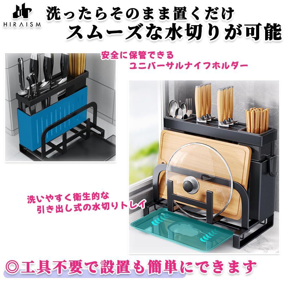 HIRAISM まな板立て 俎板スタンド 包丁 鍋蓋 箸 カトラリー 置き 多機能 収納 ラック 卓上 おしゃれ ステンレス 水切りトレー付き ブラック