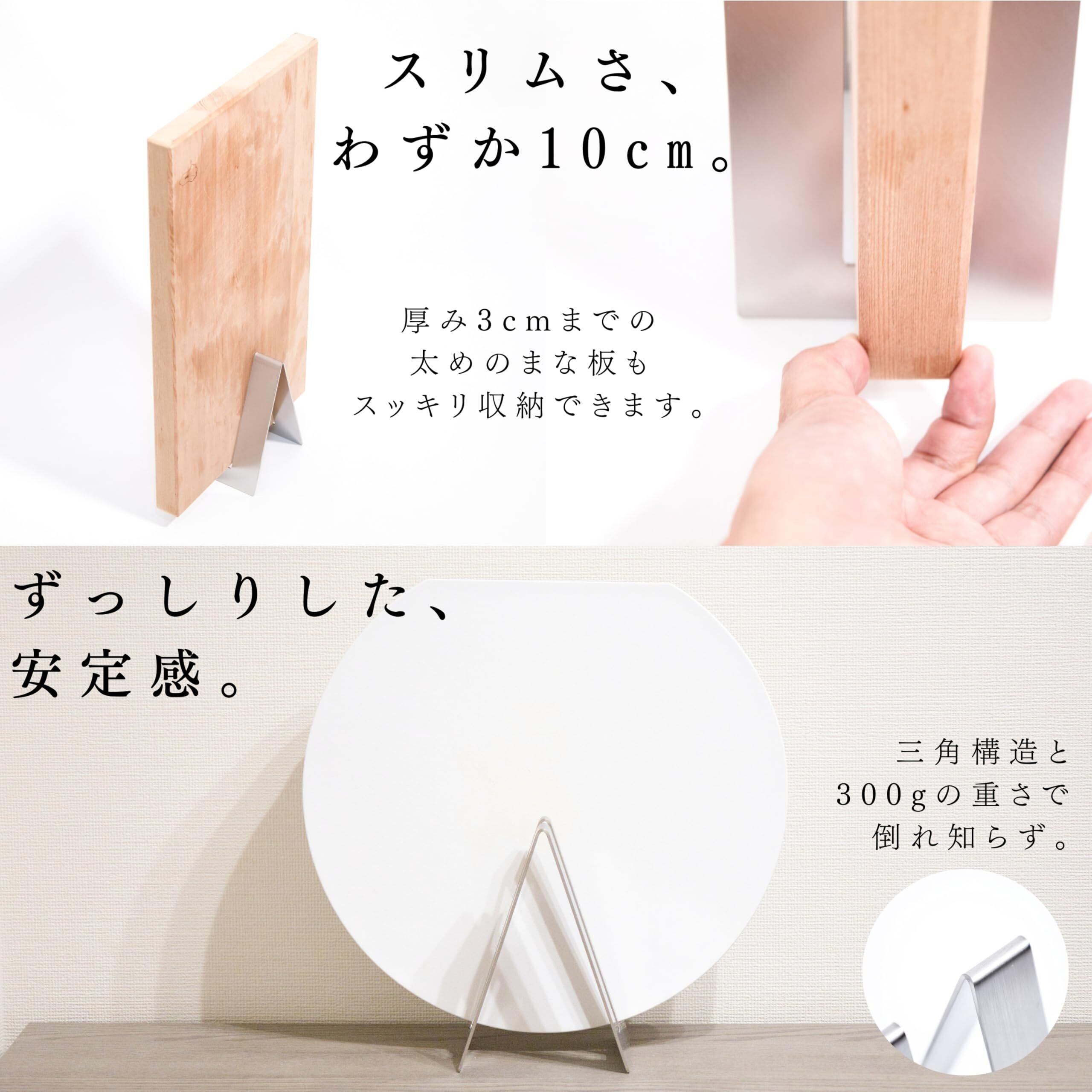 【機能性】①幅100mmのスリムなまな板たてなので場所を取りません。②3cmまでの厚みのある、ふとめの俎板をスタンドできます。③三角構造で支点が高く、倒れにくいです。④ステンレスなので錆びにくく、カビにくい為、衛生的です。