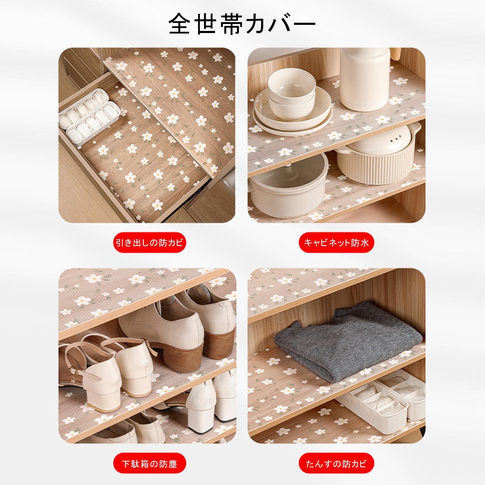 キッチンボードやキャビネットなどの上に敷いてもおしゃれで便利。ワードローブ、ドレッサーや引き出し、デスクトップ、本棚、調理台、キャビネット、シューズキャビネットの上にも敷くことができます。