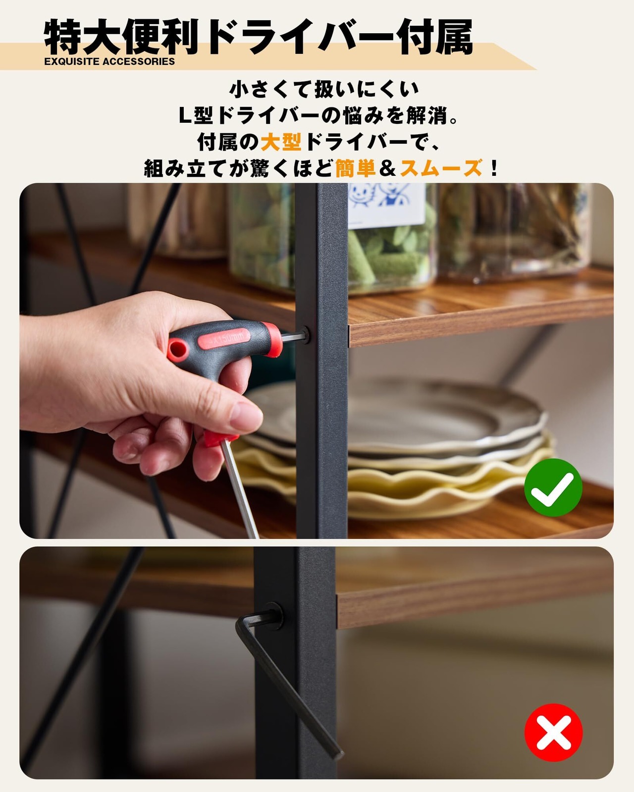 【しっかり構造】全パーツに横パイプ補強を採用し、天板・棚板はネジ止めで確実固定。長期使用でも緩みにくい設計で、耐震転倒防止パーツ付属します。