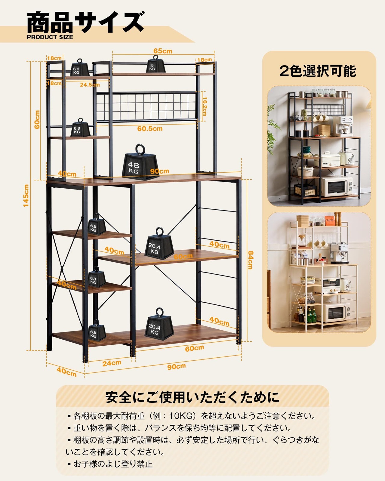 【製品仕様】商品寸法:高さ145×幅90×奥行40cm。耐荷重は棚板順に48kg/20.4kg/6.8kg。付属の図解マニュアルと専用工具で、女性でも1人で組み立て可能。炊飯器や電子レンジなどの重たい家電を置くためにも、よりスムーズで確実な組立作業をお求めの場合は、二人での組立を推奨いたします。