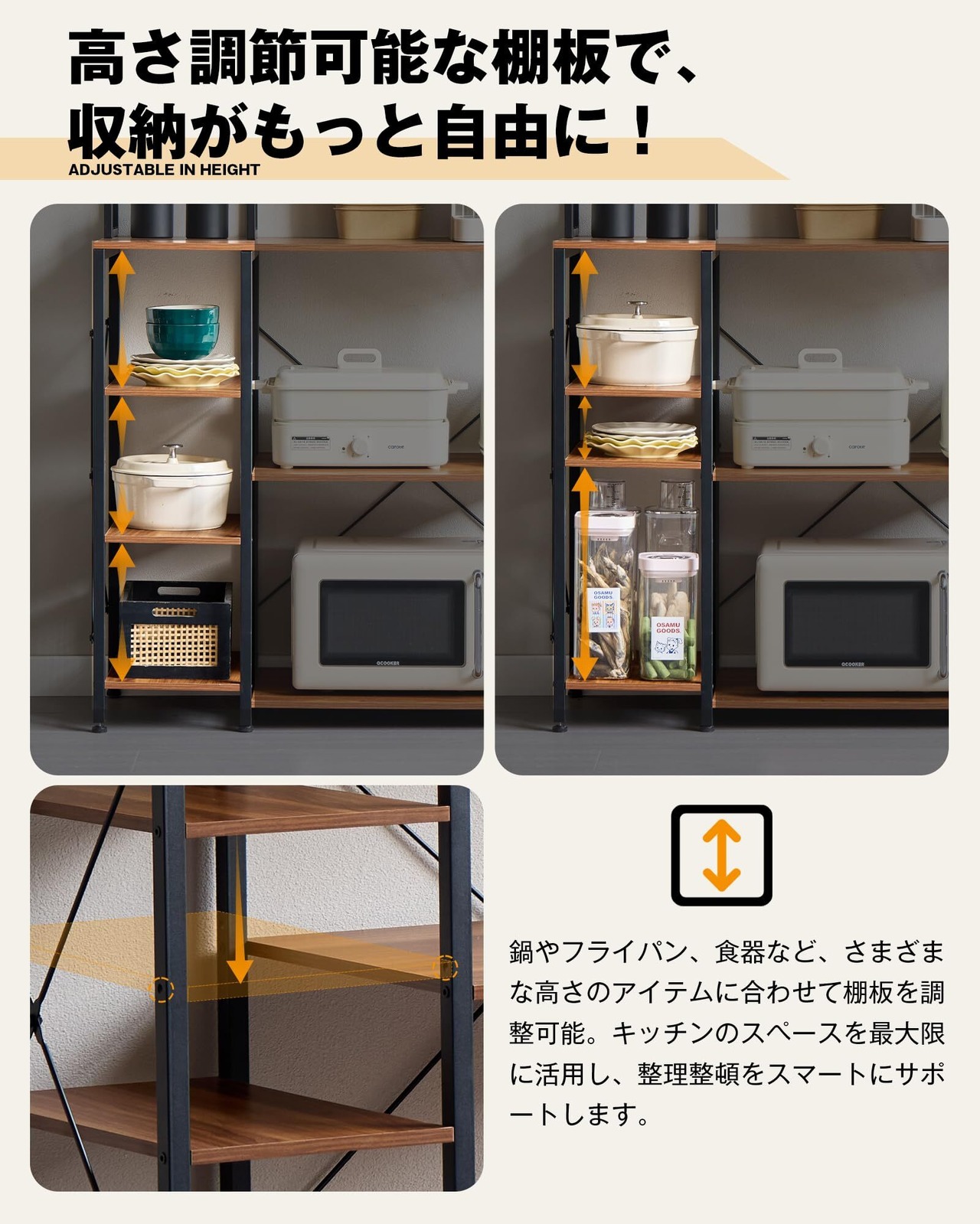 【収納力抜群】3段の棚板は全て高さ調整可能!電子レンジ、炊飯器、レンジ台として最適な高さはもちろん、食器や調味料などの収納棚としても、用途に合わせて自由にレイアウト可能。一人暮らしのキッチンから家族世帯まで、効率的なキッチン収納を実現するラック。