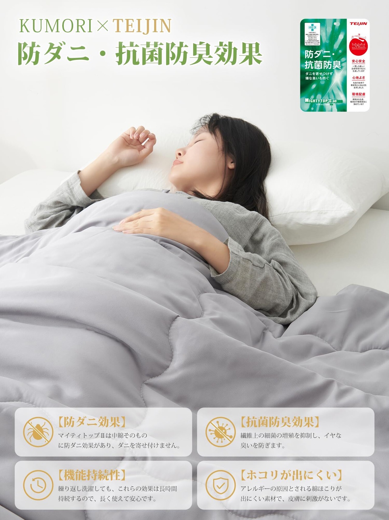 【人気商品】クモリ(Kumori) 掛け布団 シングル 合掛け布団 春夏秋 軽量 洗える 「TEIJIN 抗菌消臭中棉」 ほどよい保温力 薄手 1.3kg 柔らかい ほこりが出にくい 通気 肌掛け布団 グレー 150X210cm