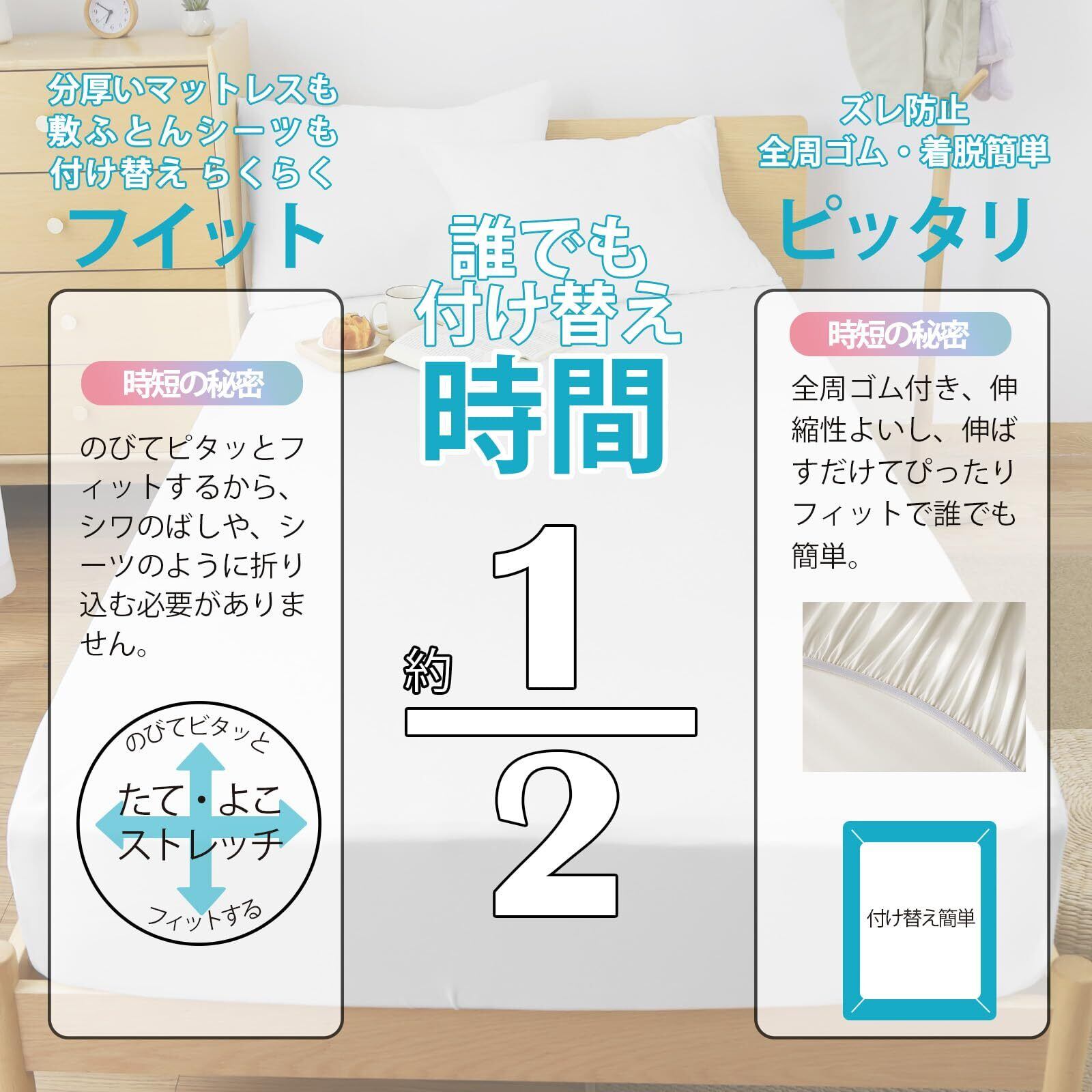 【伸縮性抜群・適用幅広い】『3Dストレッチ』特性を持ち、タテにもヨコにも伸びるので、マット適用サイズ幅広いです。畳の敷き布団・洋式マットレスまで幅広く対応。アイロンせずシワ一つもない、きれいなベッドに変身できるボックスシーツです。