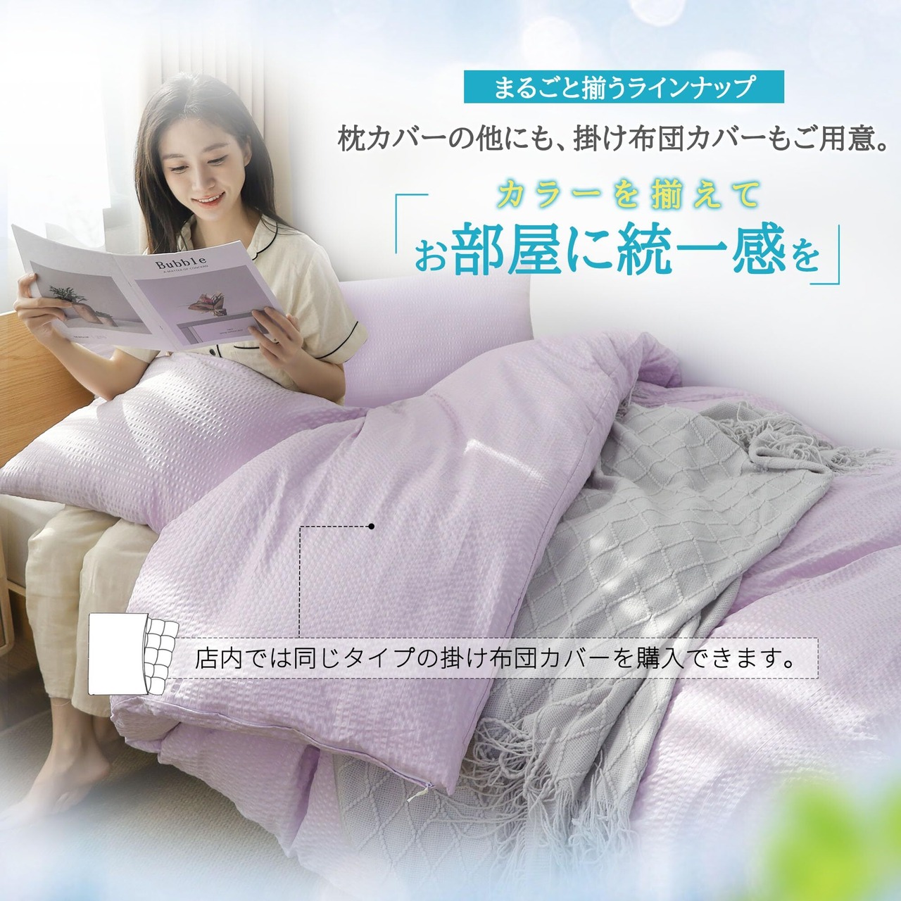 【シアサッカー風生地】枕ガバーはサラッとドライタッチな表面がポコポコとしたシアサッカー風の素材を使用。シアサッカーとはさらりとした感触で肌ざわりもよく、涼しくて快適な夏にオススメの素材です。くしゆくしゅしたシワ感が特徴的な凹凸感のある生地です。四季を通じて利用できます。