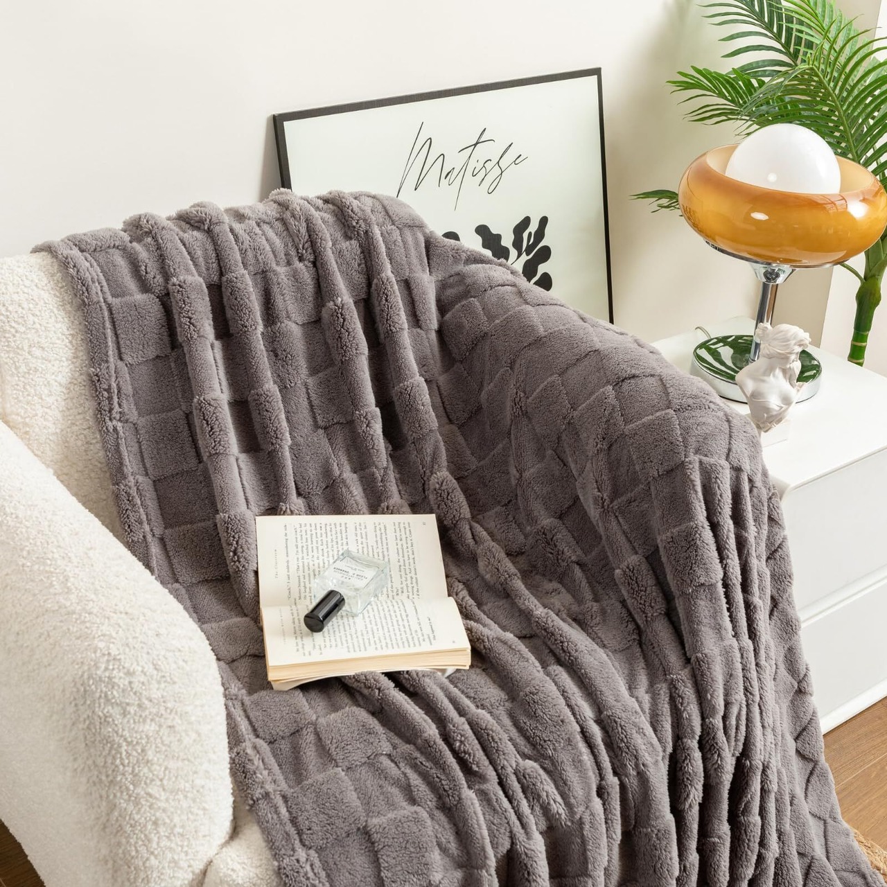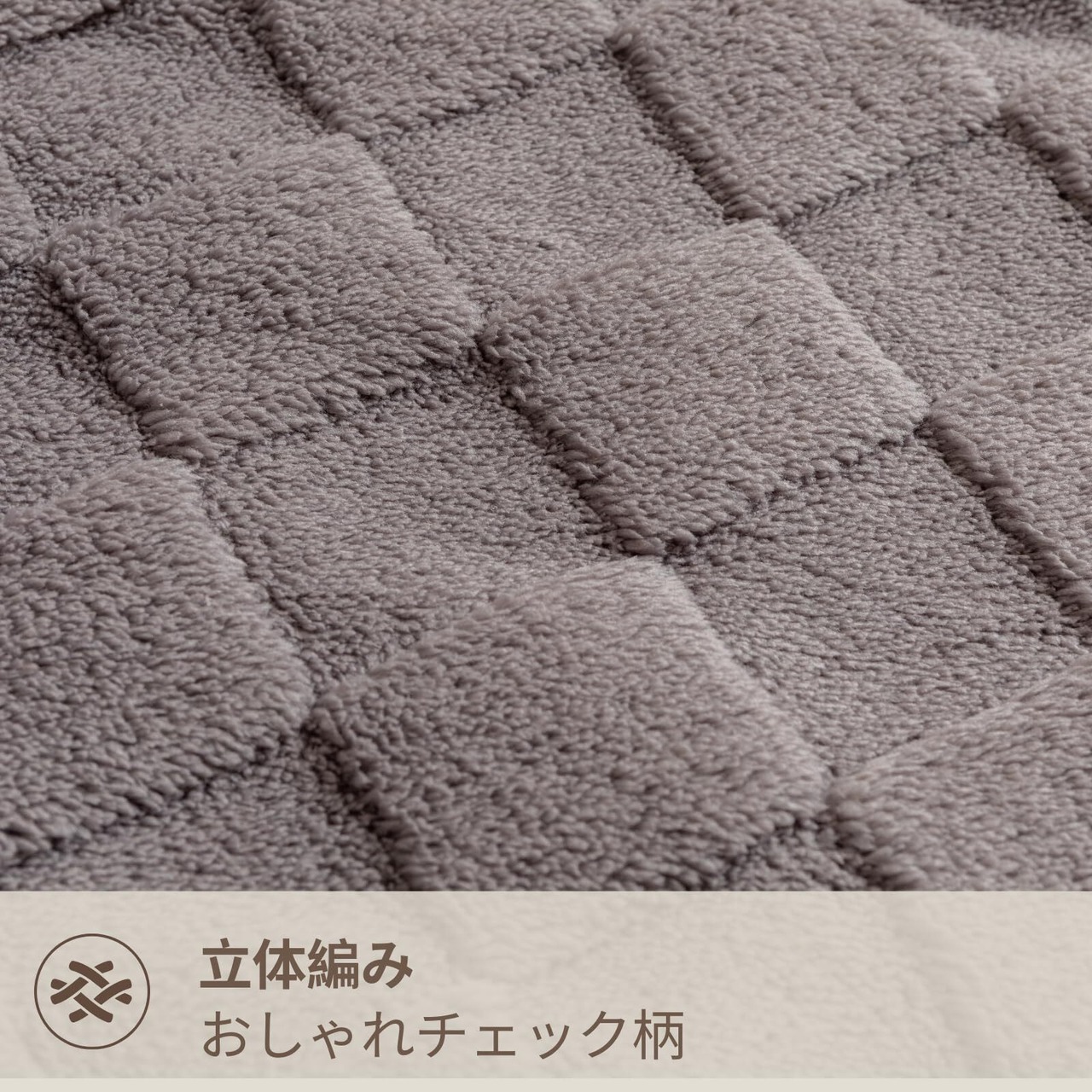 モダンデザインとリバーシブル立体編みによるチェック柄が特徴で、おしゃれな雰囲気を醸し出します。リバーシブル仕様で、裏表両面とも同じデザインを楽しむことができます。モダンなデザインはどんなインテリアにもマッチし、リビングや寝室をスタイリッシュに演出します。