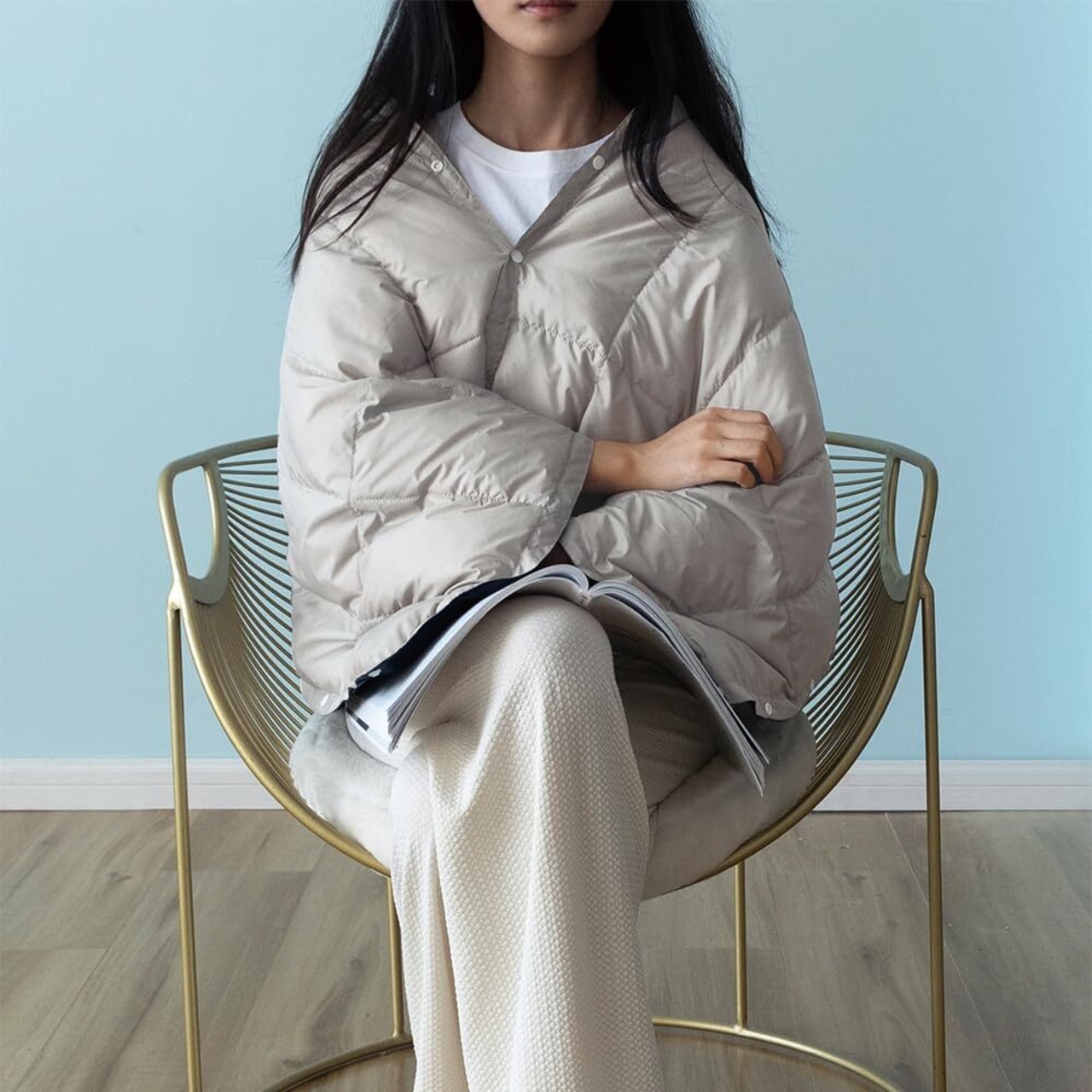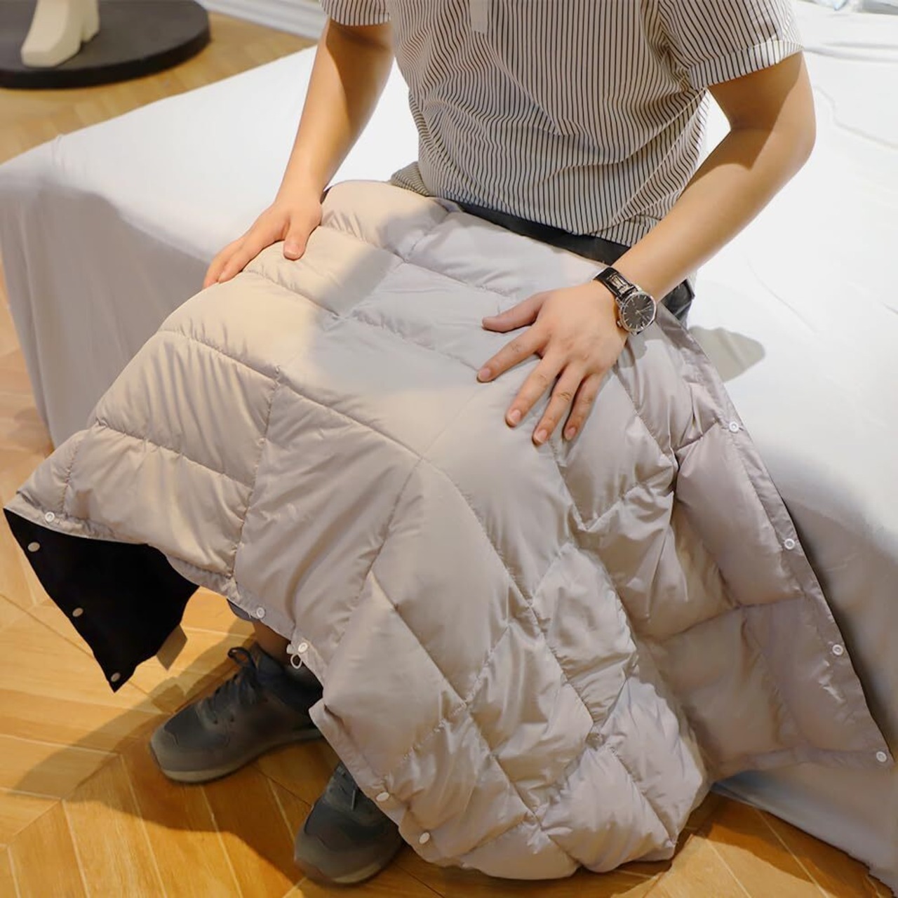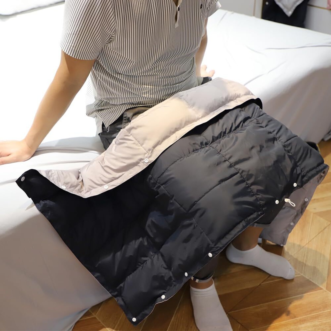 【用途が多い】ダウンケットは4WAY羽毛ブランケットです。ハ一フサイズだから、オ一ルシ一ズン使えます。スナップボタンとゴム入りのギャザー付きなので、これ1枚でポンチョ・腰巻き・膝掛け・ブランケットの4通りの使い方ができます。