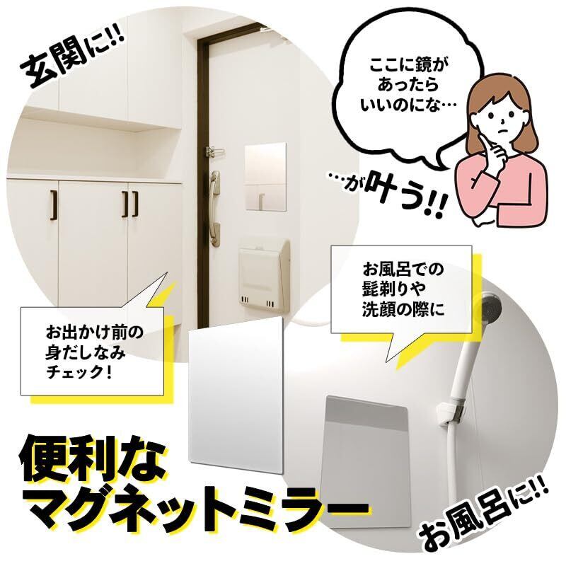 ちょっとしたところにあると便利!マグネットで玄関やお風呂、冷蔵庫に貼れる、マグネットミラーです。