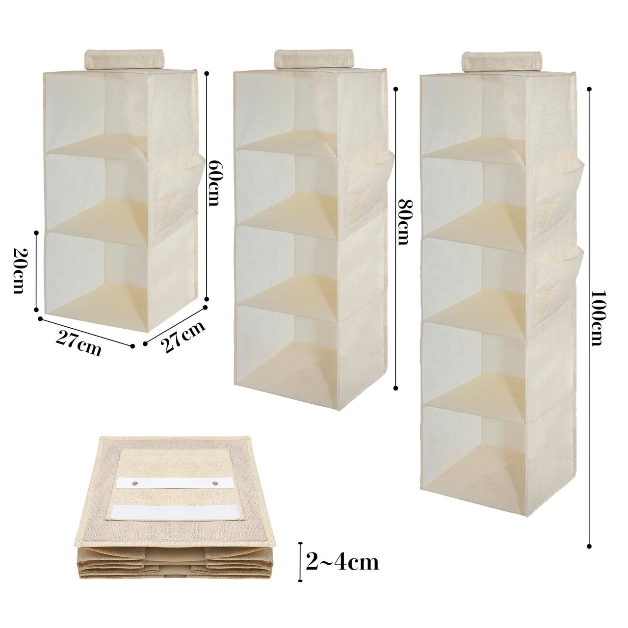 YRCBEHFU 吊り下げ収納 【最新強化版】 クローゼット 収納吊り下げ 3段 PPボード 大容量 衣類ラック 帽子/鞄 収納/旅行/出張 取付簡単 折り畳み式(ベージュ、27x27x60cm)